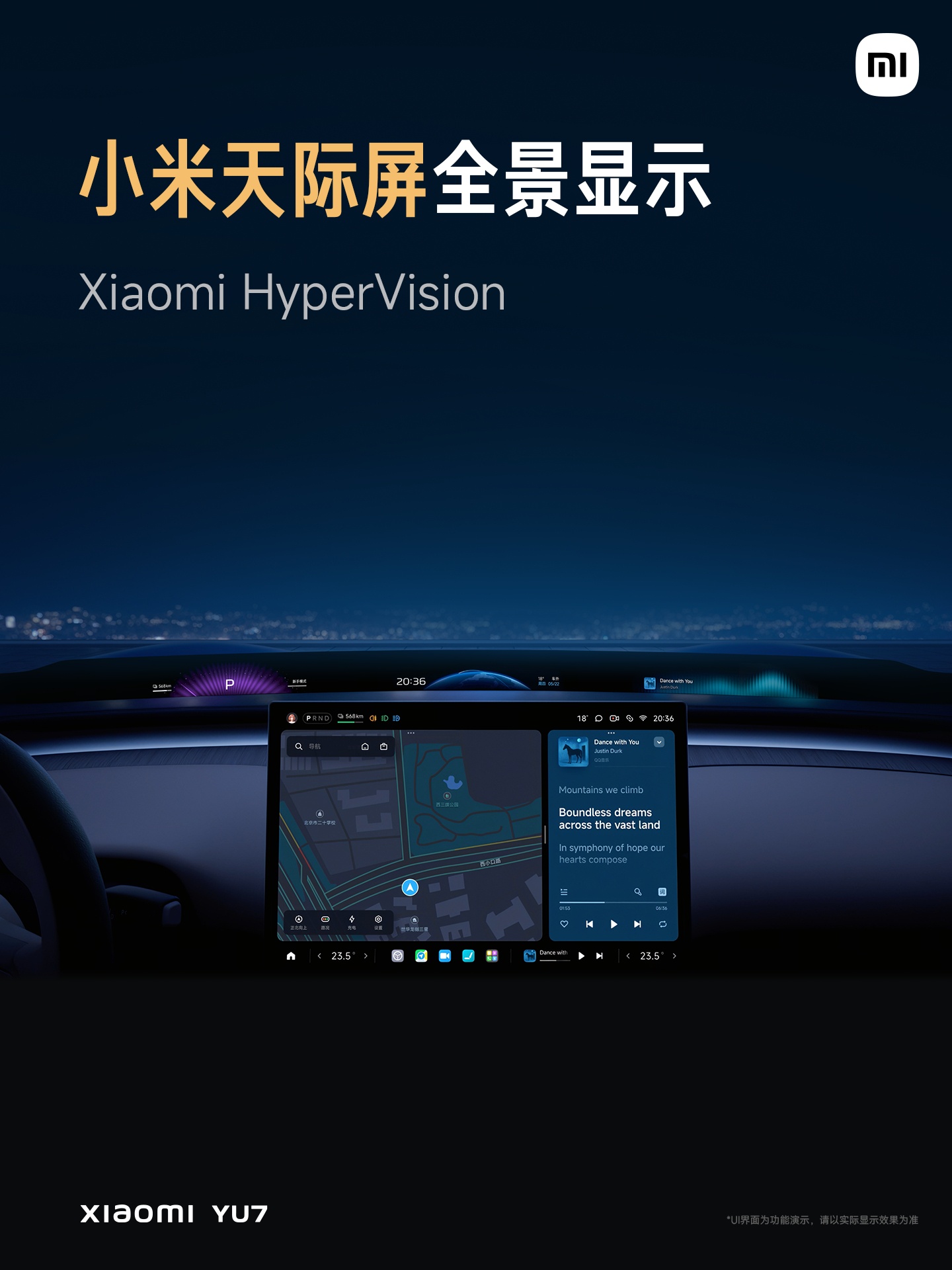 - Conceput pentru o utilizare personalizată, Xiaomi HyperVision Panoramic Display se adaptează inteligent la diferite scenarii de utilizare. Șoferii beneficiază de proiecții de viteză și navigație poziționate optim în liniile lor naturale de vizibilitate, în timp ce pasagerii din față își pot personaliza experiența de divertisment cu interfețe muzicale reglabile în funcție de amplasare, cu versuri în timp real.