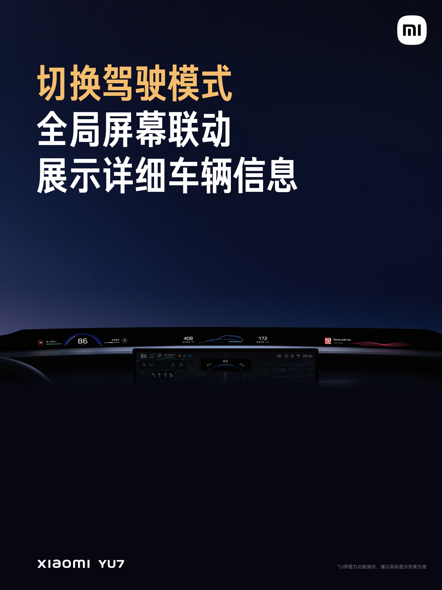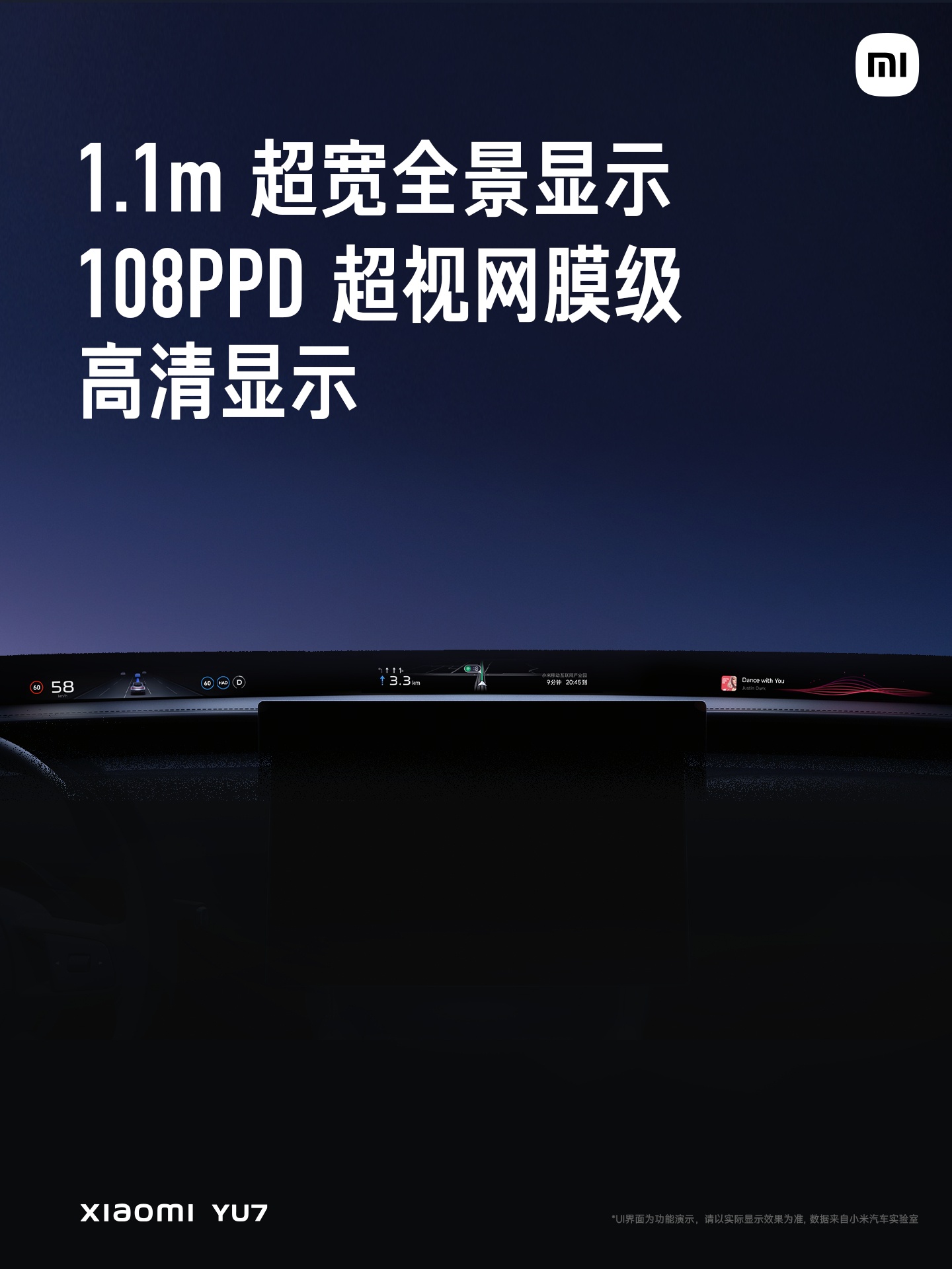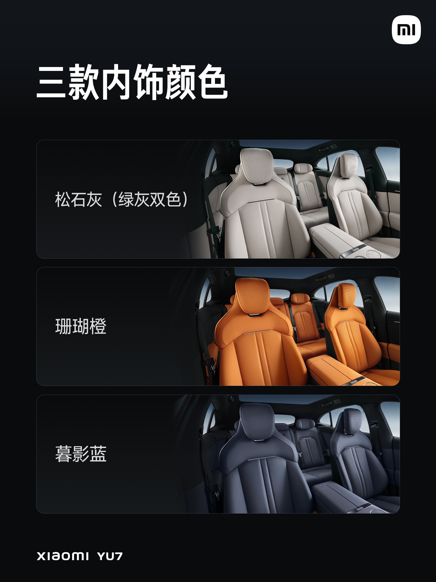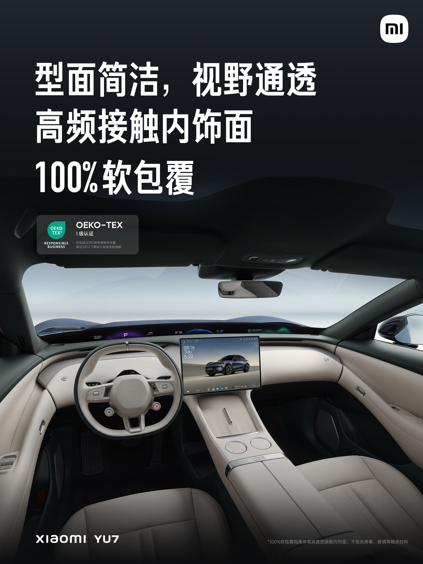 - Interiorul lui Xiaomi YU7 are o vedere curată și neobstrucționată. Planșa de bord adoptă un design stratificat, integrând foarte bine airbagurile, ecranele și gurile de aerisire ascunse. Dispunerea este optimizată meticulos pentru a crea un tablou de bord subțire care se află mai jos și mai în față, reducând senzația de volum și opresiune a tablourilor de bord tradiționale ale SUV-urilor. Acest lucru sporește vibrația sportivă, îmbunătățind în același timp senzația de spațiu.