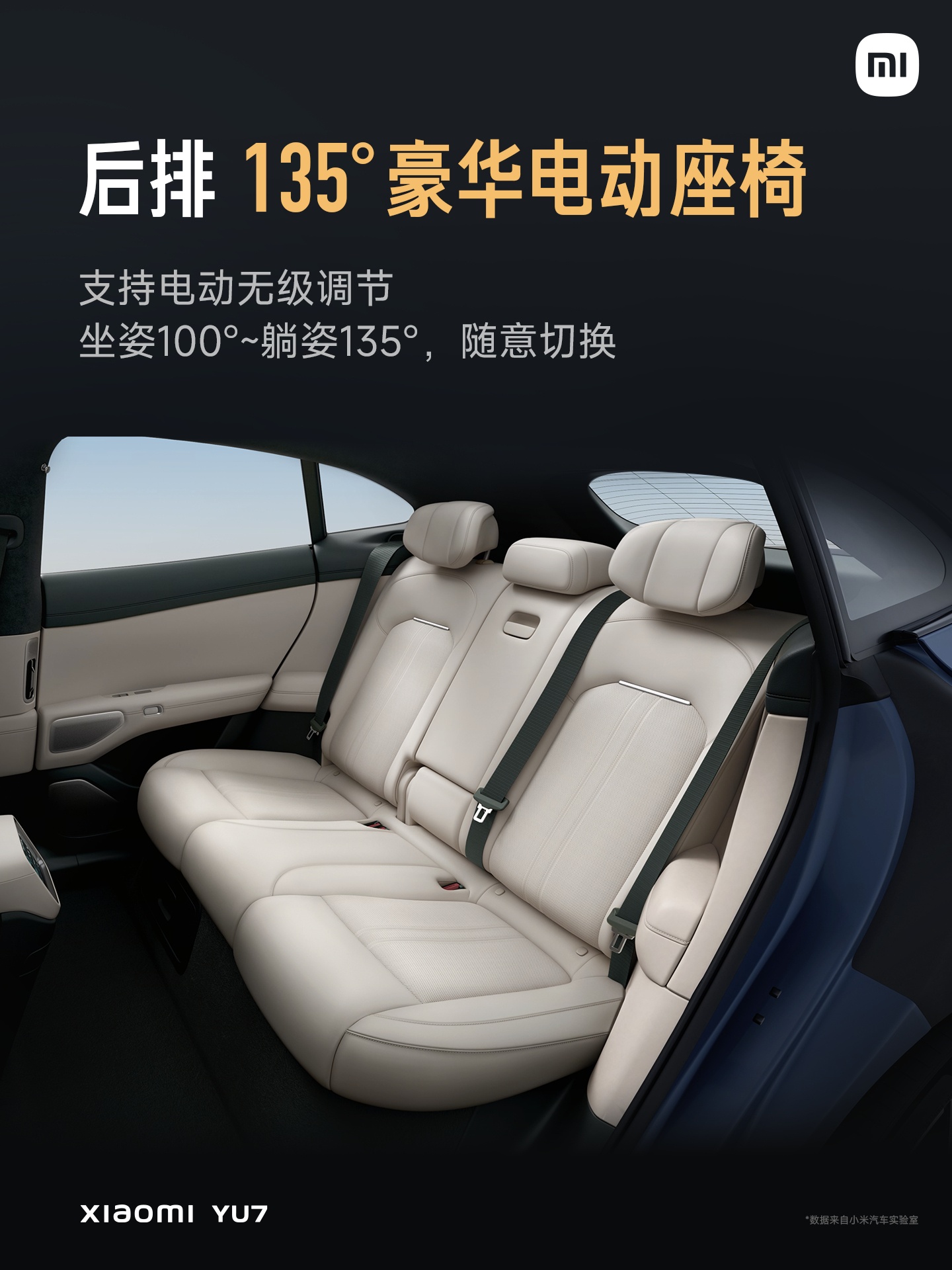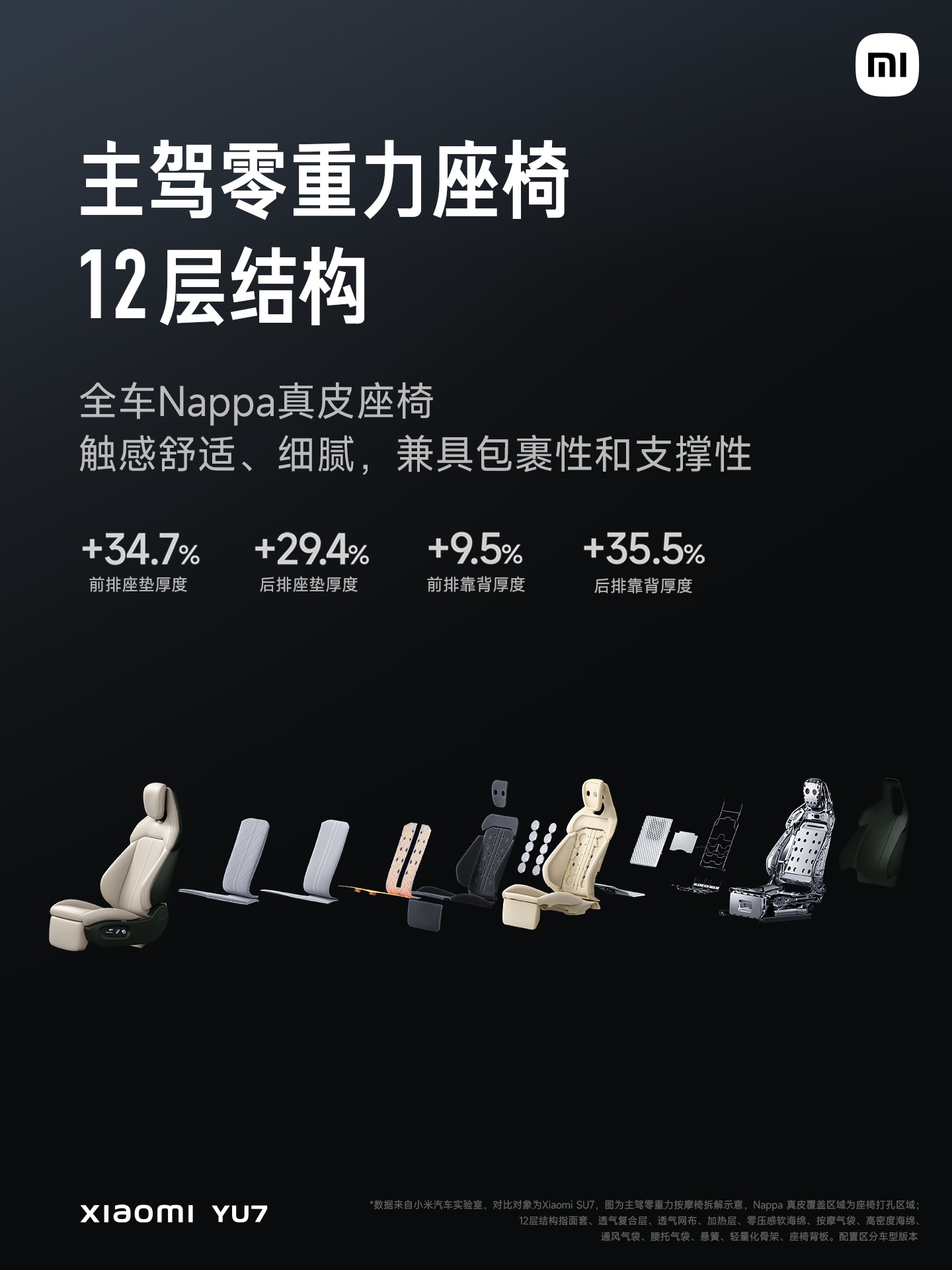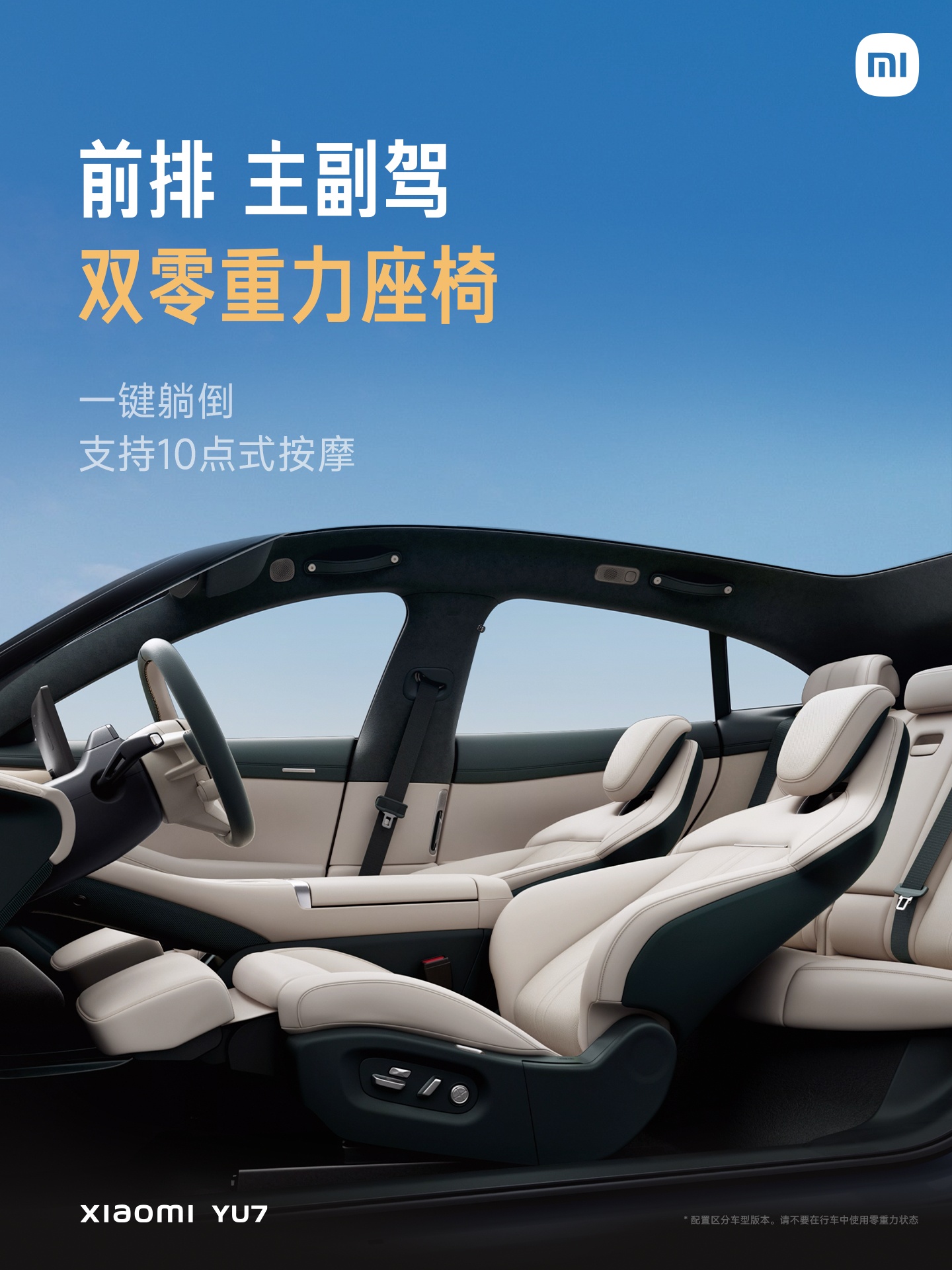 - În ceea ce privește scaunele, Xiaomi YU7 dispune de două scaune frontale cu funcție Zero Gravity, oferind o înclinare cu o singură atingere și masaj în 10 puncte care vizează punctele cheie de acupunctură din partea din spate a corpului.