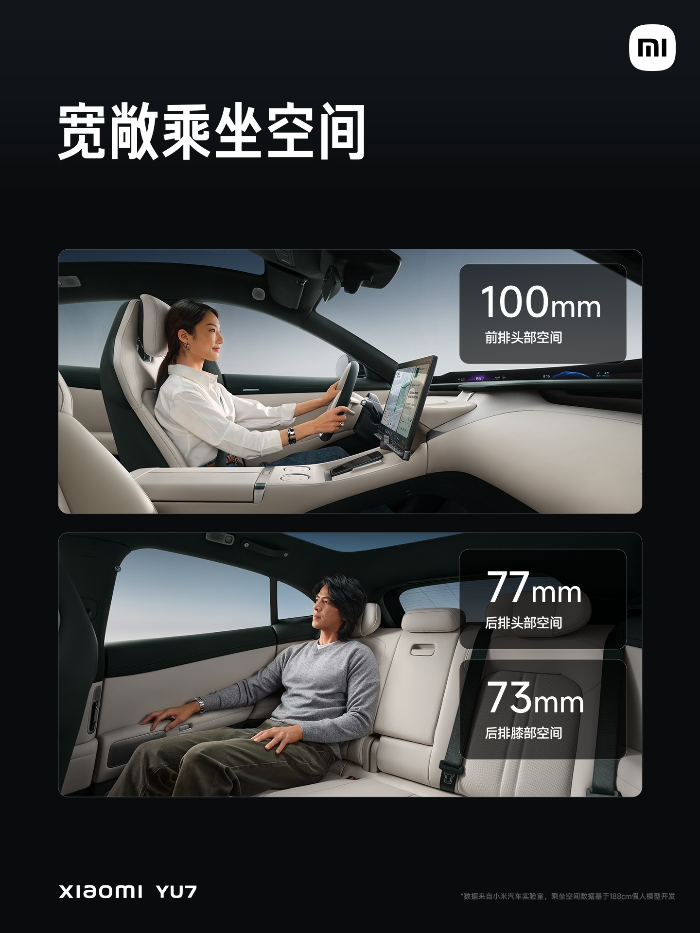 - Xiaomi YU7 îmbină magistral stilul dinamic cu spațialitatea interioară excepțională, obținând o eficiență remarcabilă a spațiului prin inginerie inovatoare. Proiectat folosind un model antropometric de 188 cm, habitaclul oferă spații generoase cu 100 mm spațiu pentru cap în față, 77 mm spațiu pentru cap în spate și 73 mm spațiu pentru picioare în spate, depășind concurenții din segmente similare. Această optimizare impresionantă a spațiului vertical provine din tehnologia avansată de integrare a bateriei (CTB) de la Xiaomi și din grosimea redusă a podelei, creând un mediu aerisit, fără obstacole pentru toți ocupanții.