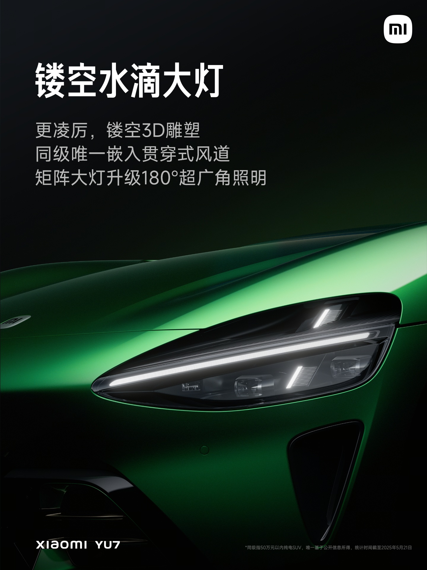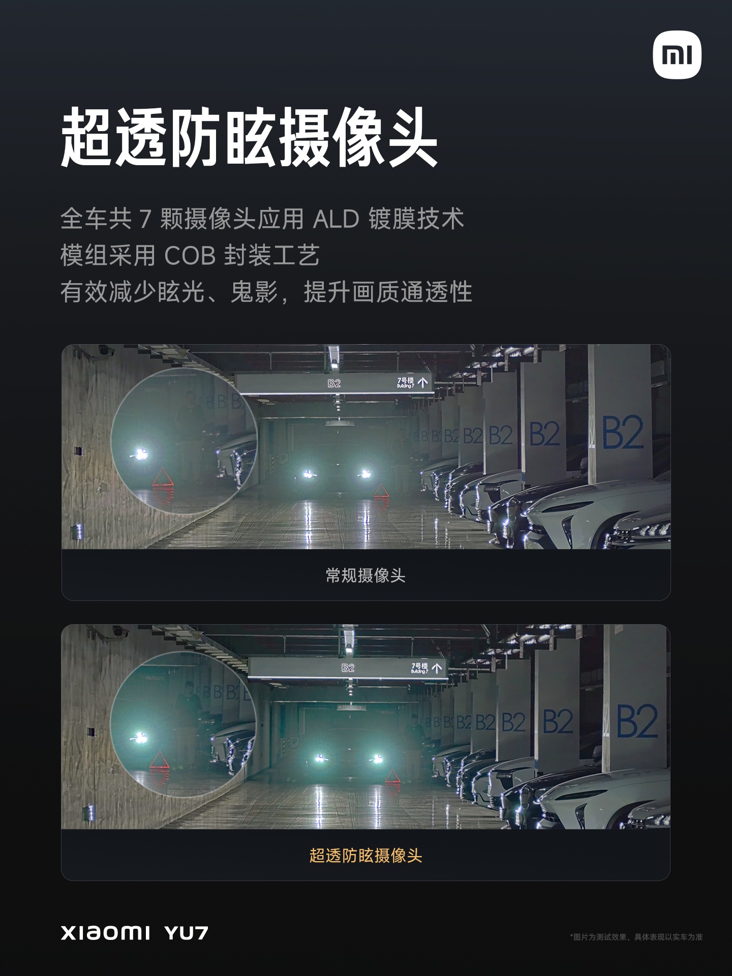 - În plus, Xiaomi YU7 este echipat cu șapte camere antiorbire ultra-transparente. Lentilele utilizează tehnologia de acoperire ALD, iar modulul adoptă tehnologia de ambalare COB pentru a reduce reflexia luminii în interiorul lentilei, a crește transmitanța, a obține o calitate mai clară și mai transparentă a imaginii și a suprima în mod eficient interferențele vizuale cauzate de lumina de fundal și de strălucire.