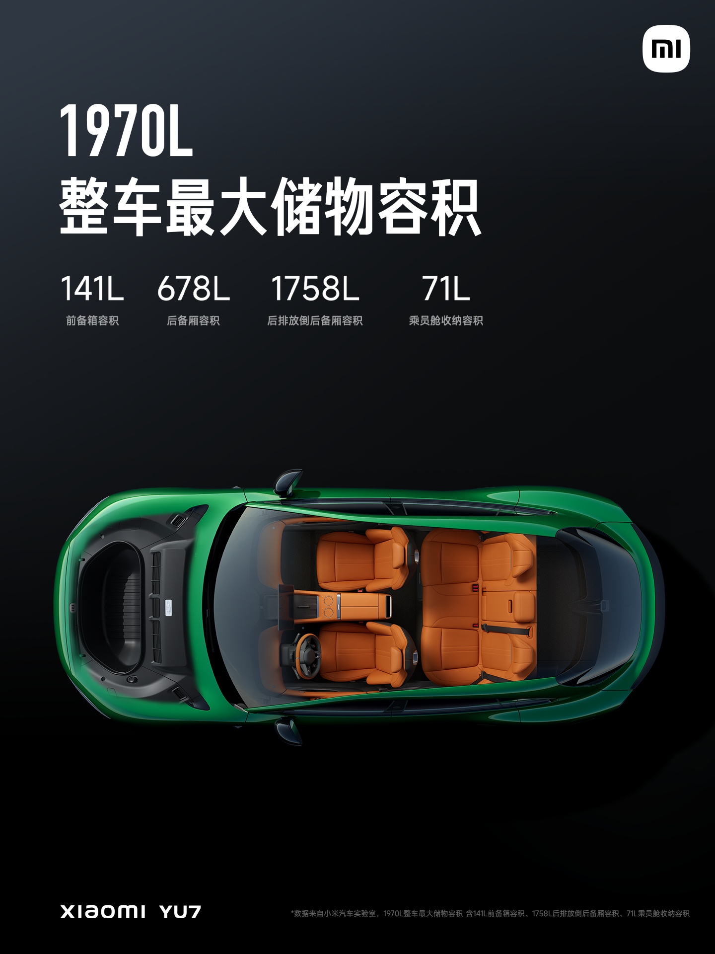 - Xiaomi YU7 oferă și un caracter practic remarcabil cu o capacitate totală de depozitare de 1970 litri, inclusiv un portbagaj frontal de 141 litri și un portbagaj de 678 litri, care se extinde la 1758 litri cu scaunele din spate rabatate. Designul inteligent de depozitare oferă încă 71 de litri prin habitaclu.