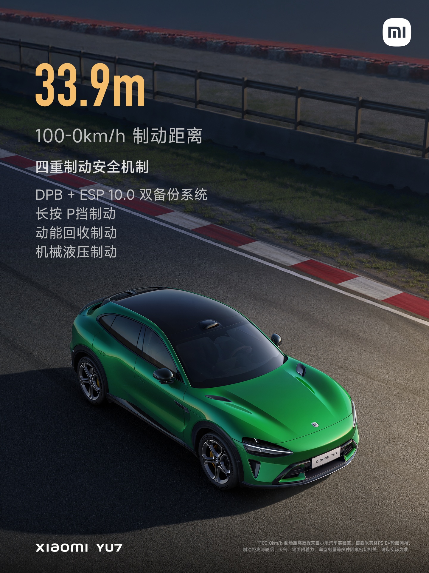 - Distanța de frânare declarată de la 100 la 0 km/h – 33.9 metri (cea mai scurtă din segment). Utilizează mecanisme de la Brembo (doar pe Xiaomi YU7 Max), iar YU7 Pro are etriere fixe cu patru pistoane.