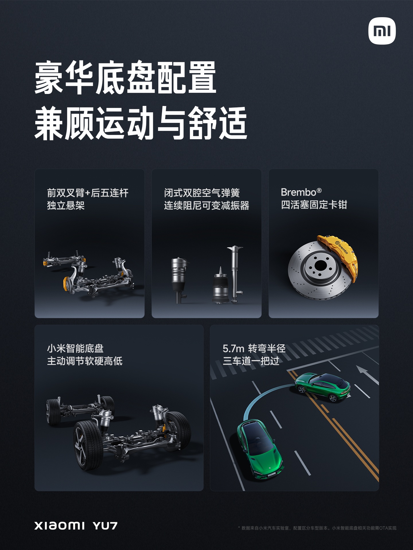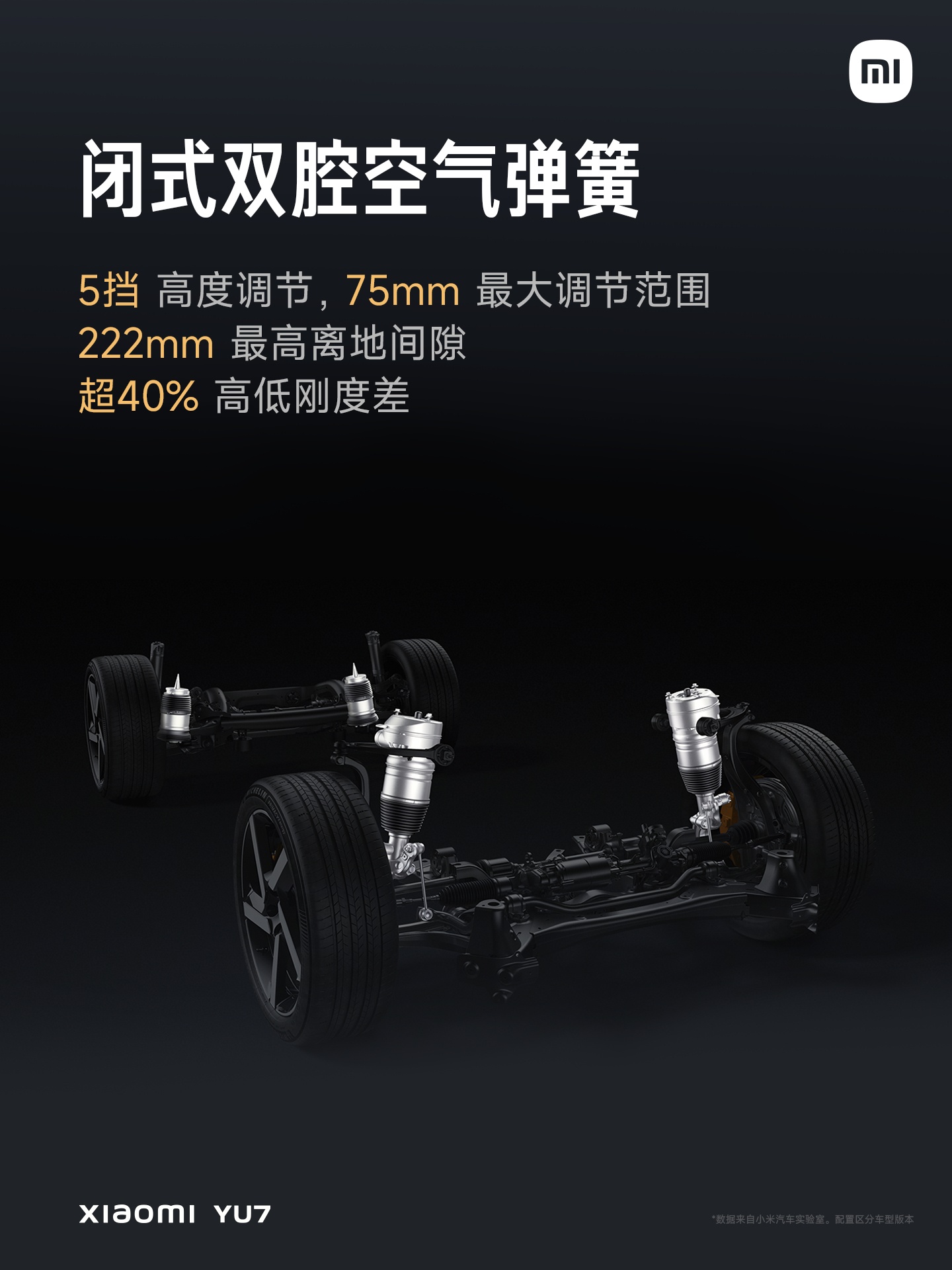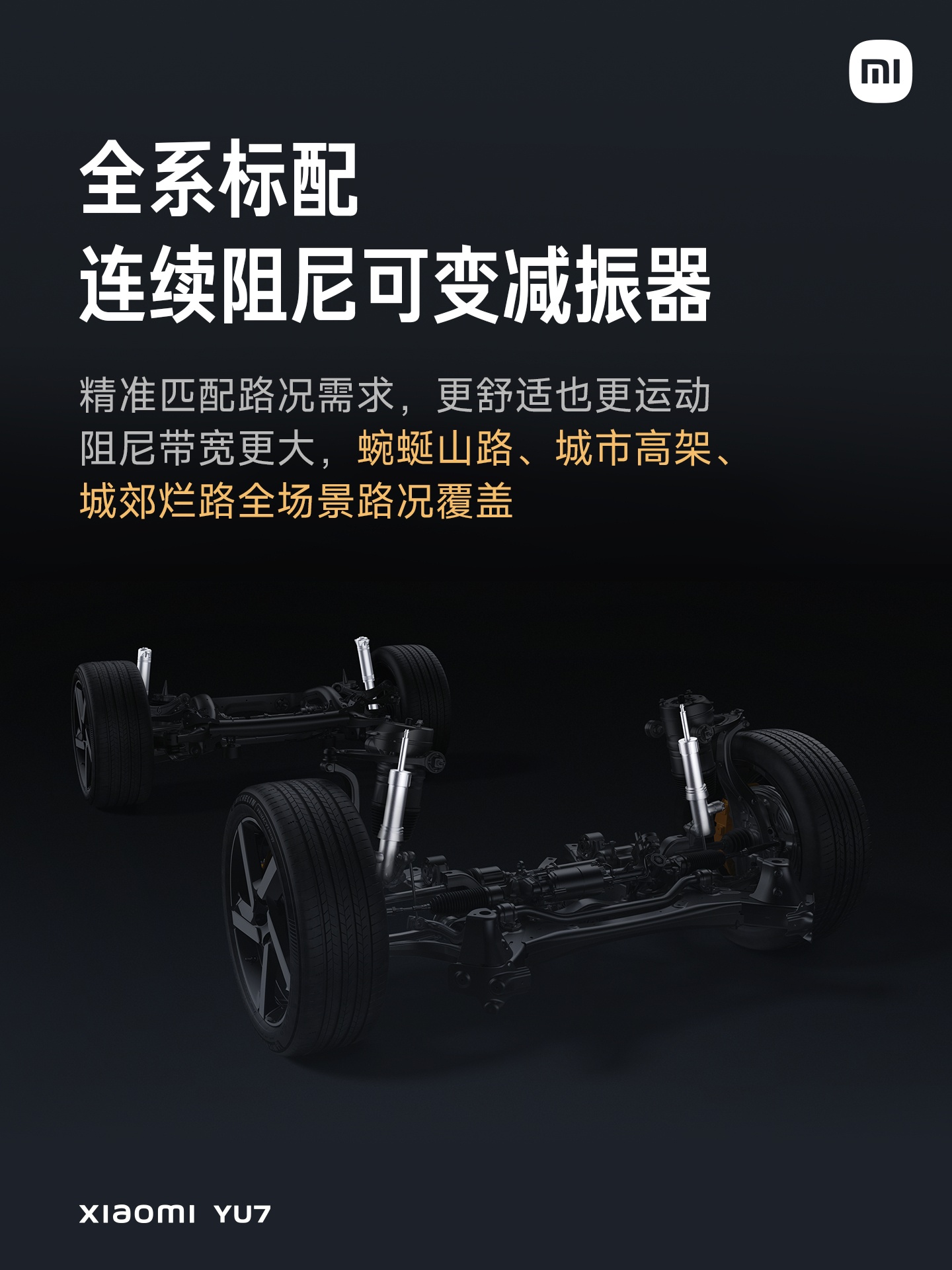 - Standard pentru toate mașinile sunt amortizoare variabile cu amortizare continuă. Intervalul de reglare este cu 10% mai mare decât pe Xiaomi SU7 Max, iar lățimea de bandă de amortizare este mai mare.