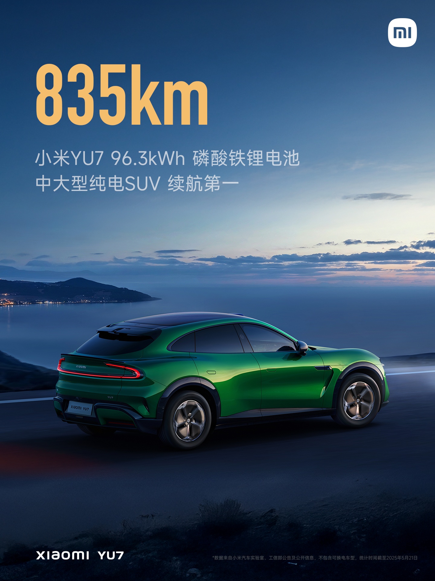 - Xiaomi YU7 va propune până la 835 km autonomie (CLTC) cu o baterie LFP de 96.3 kWh, fiind clasat la acest aspect pe primul loc în gama de SUV-uri electrice pure de mărimi medii și mari cu baterie mai mică de 100 kWh.