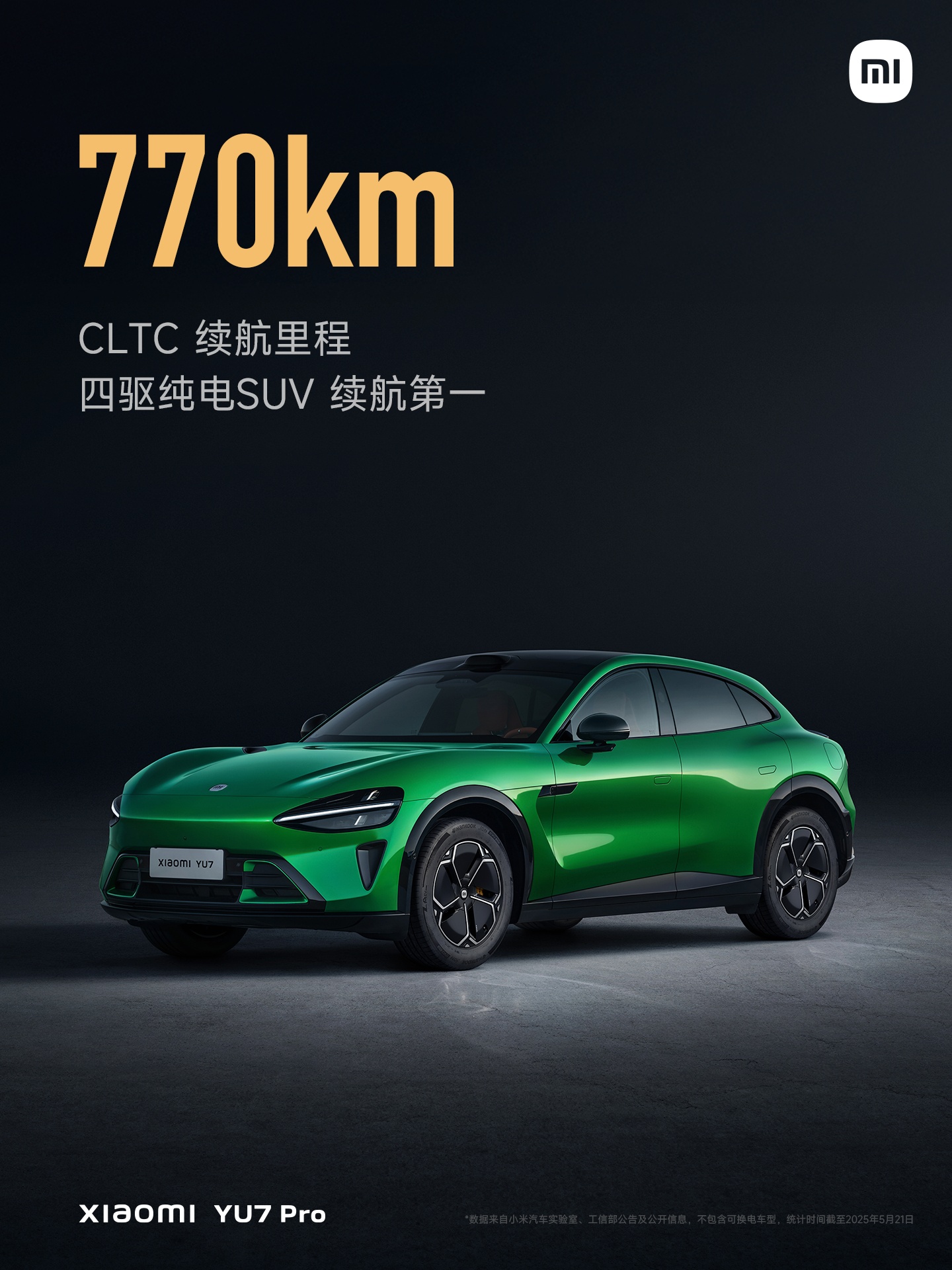 - Xiaomi YU7 Pro – până la 770 km (CLTC) cu aceeași baterie, clasat pe primul loc în gama de SUV-uri electrice pure cu AWD.