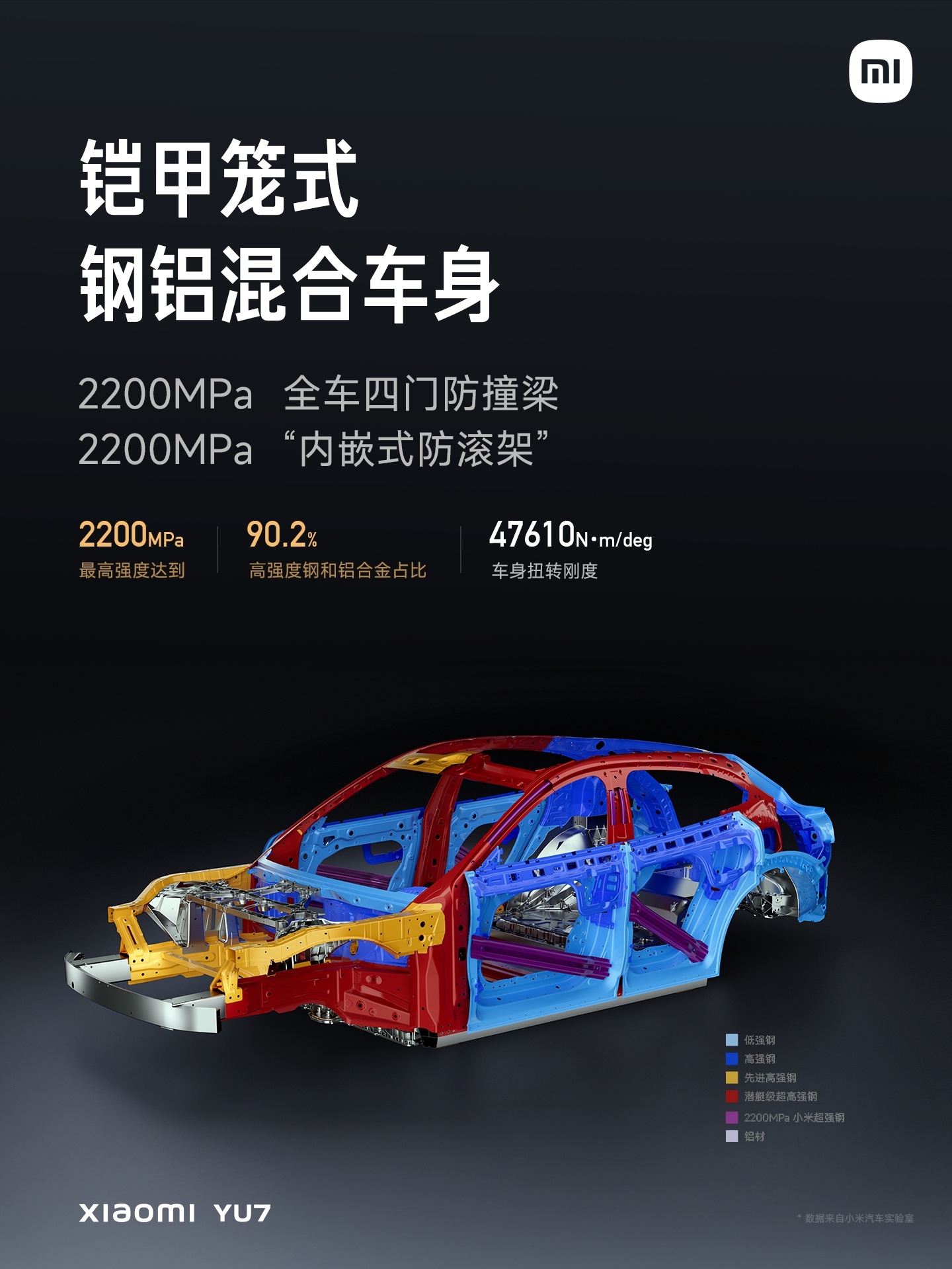 - Pe Xiaomi YU7, cadrul hibrid de oțel-aluminiu cu o cușcă blindată, care este proiectat pe platforma Xiaomi Modena, a fost îmbunătățit în mod cuprinzător.