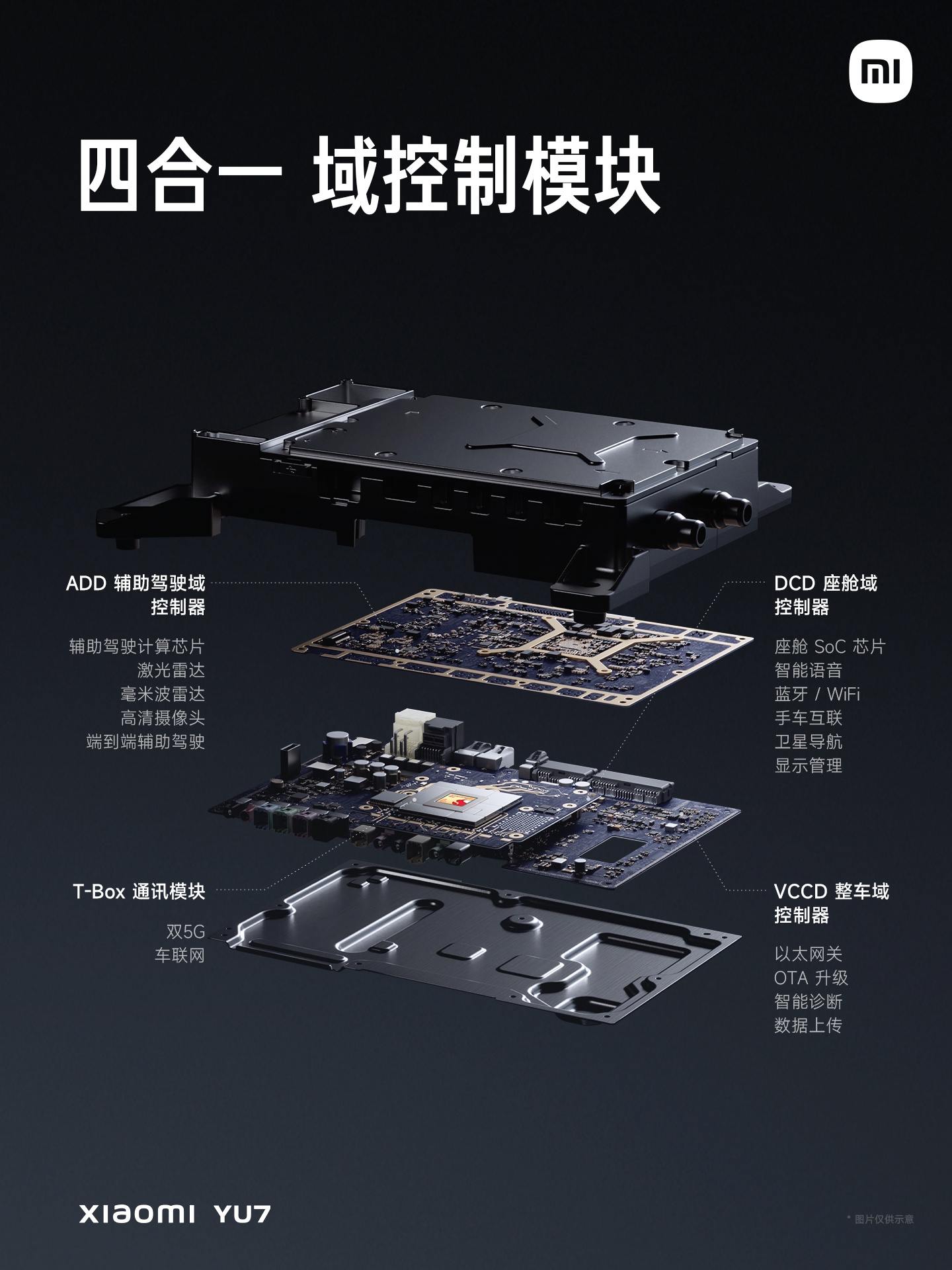 - În primul rând, Xiaomi YU7 adoptă un “Modul de control al domeniului Four-in-One”, integrând controlerul domeniului de conducere asistată (ADD), controlerul domeniului cockpitului digital (DCD), domeniul de control central al vehiculului (VCCD) și Telematics Box (T-Box). Acesta consolidează zeci de module funcționale, servind ca o unitate centrală de procesare foarte integrată.