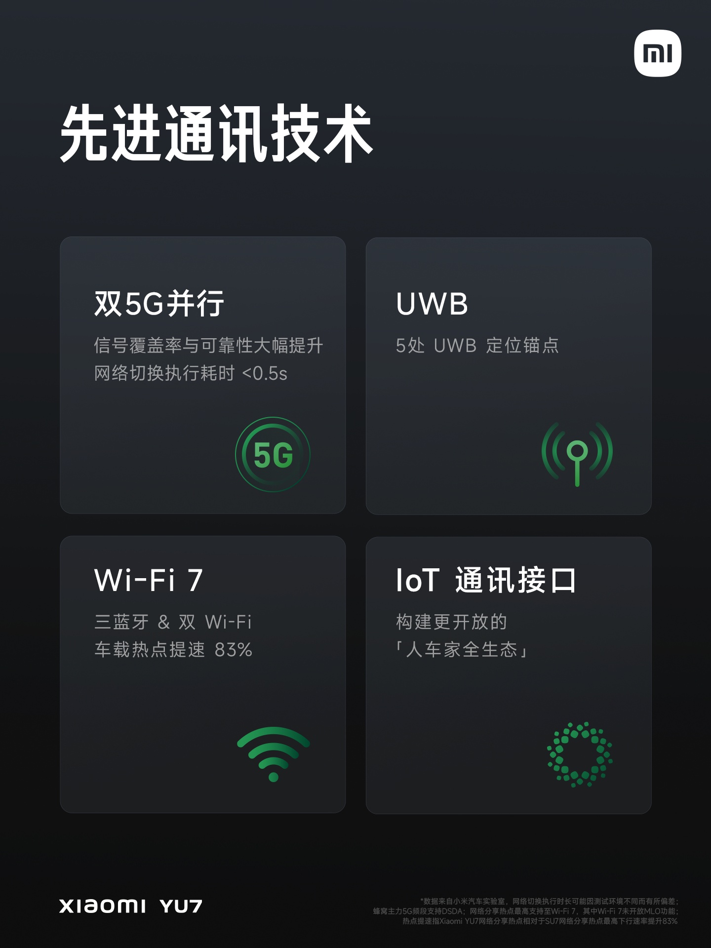 - În cele din urmă, EEA Xiaomi actualizat aduce tehnologii avansate de comunicare la bord. Xiaomi YU7 are o rețea de comunicare paralelă 5G duală, lider în industrie, o nouă cheie UWB și primul Wi-Fi 7 lansat într-o mașină. Cu trei module Bluetooth și Wi-Fi dual, hotspotul de la bord este cu 83% mai rapid, oferind în același timp mai multe interfețe IoT, stabilind un ecosistem inteligent mai deschis “Human x Car x Home”.