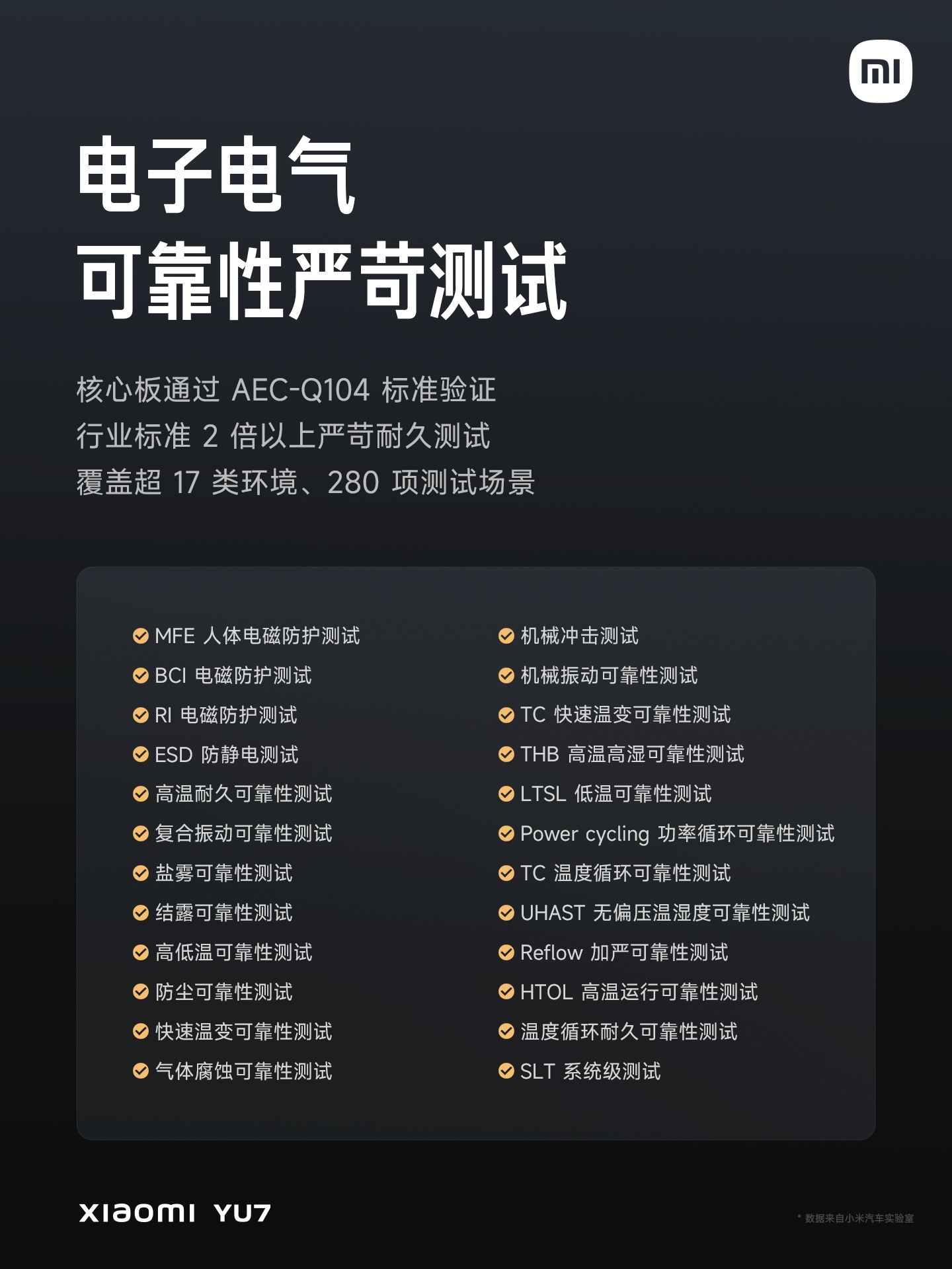 - Noua generație Xiaomi EEA a fost supusă unor teste de fiabilitate cuprinzătoare și riguroase. Plăcile sale de bază au trecut testele de grad auto AEC-Q104, îndeplinind de peste două ori standardul industriei pentru testele de anduranță. Testele acoperă peste 17 categorii de mediu și 280 de scenarii de testare.