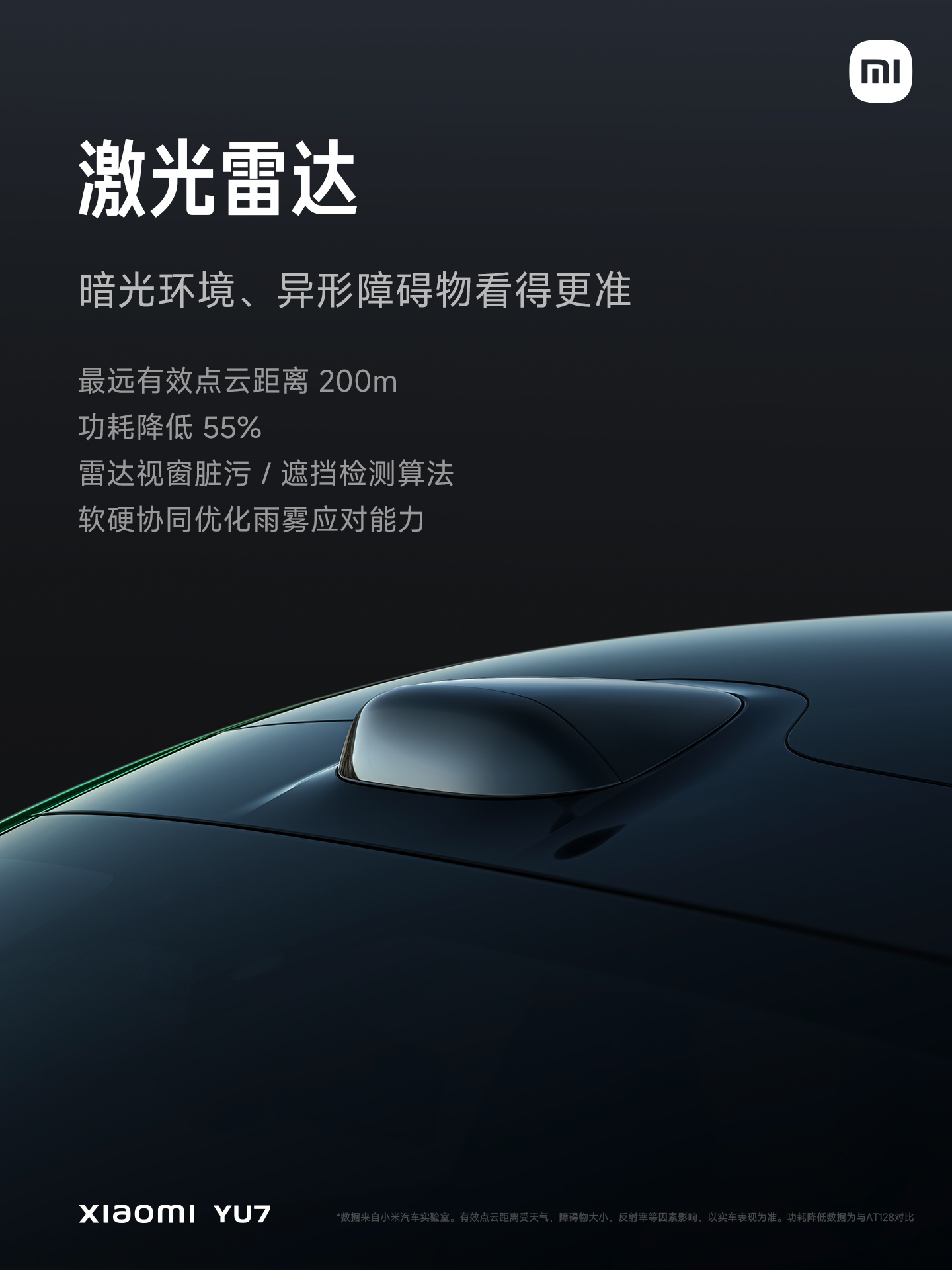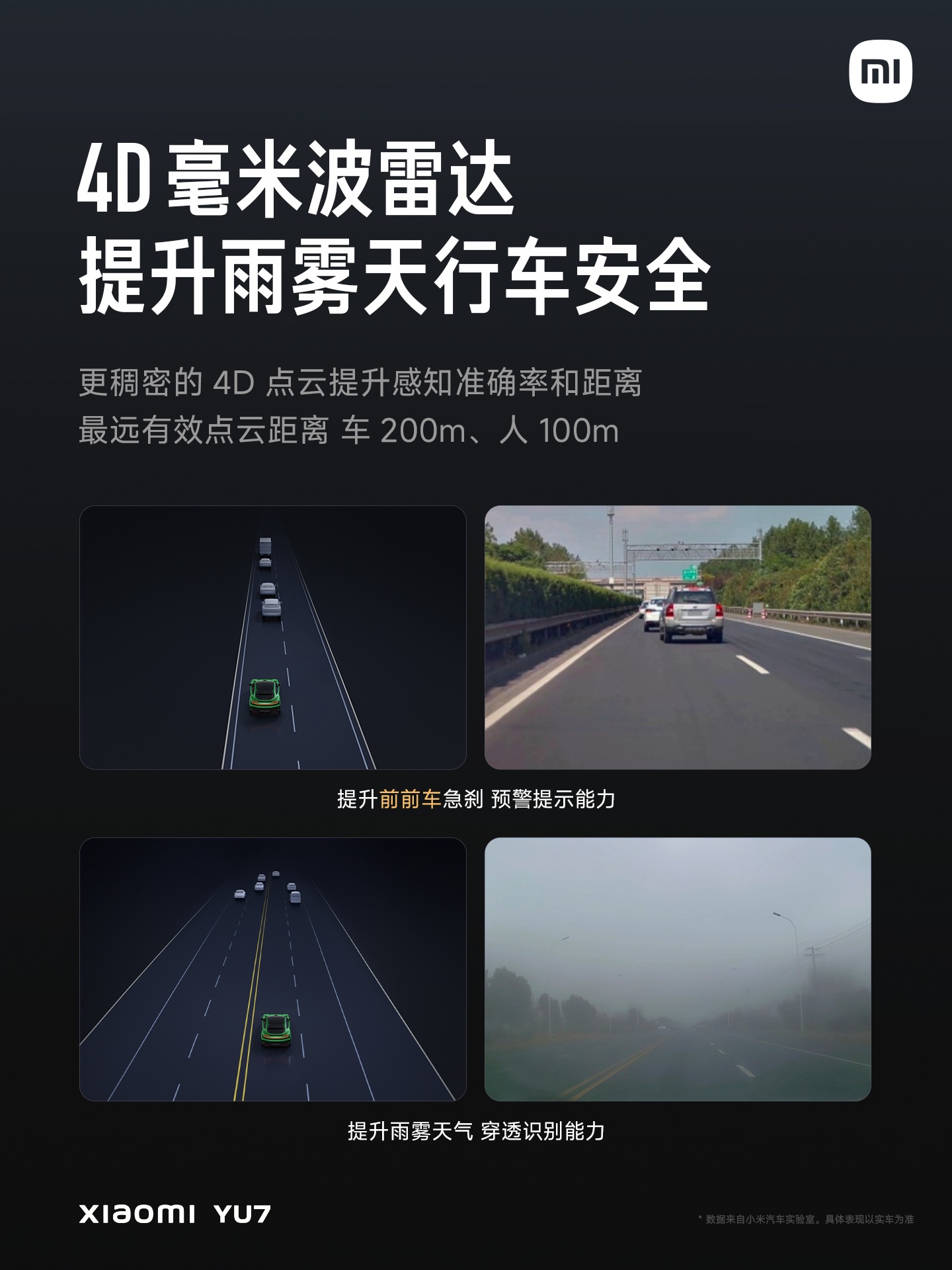 - În același timp, întreaga serie Xiaomi YU7 este echipată cu radar cu unde milimetrice 4D, care are informații sporite despre altitudine în comparație cu undele milimetrice 3D și rezoluție și distanță de recunoaștere mult îmbunătățite. Distanța maximă efectivă de detectare a norului de puncte pentru identificarea unei mașini este de 200 m, iar pentru o persoană, este de 100 m.