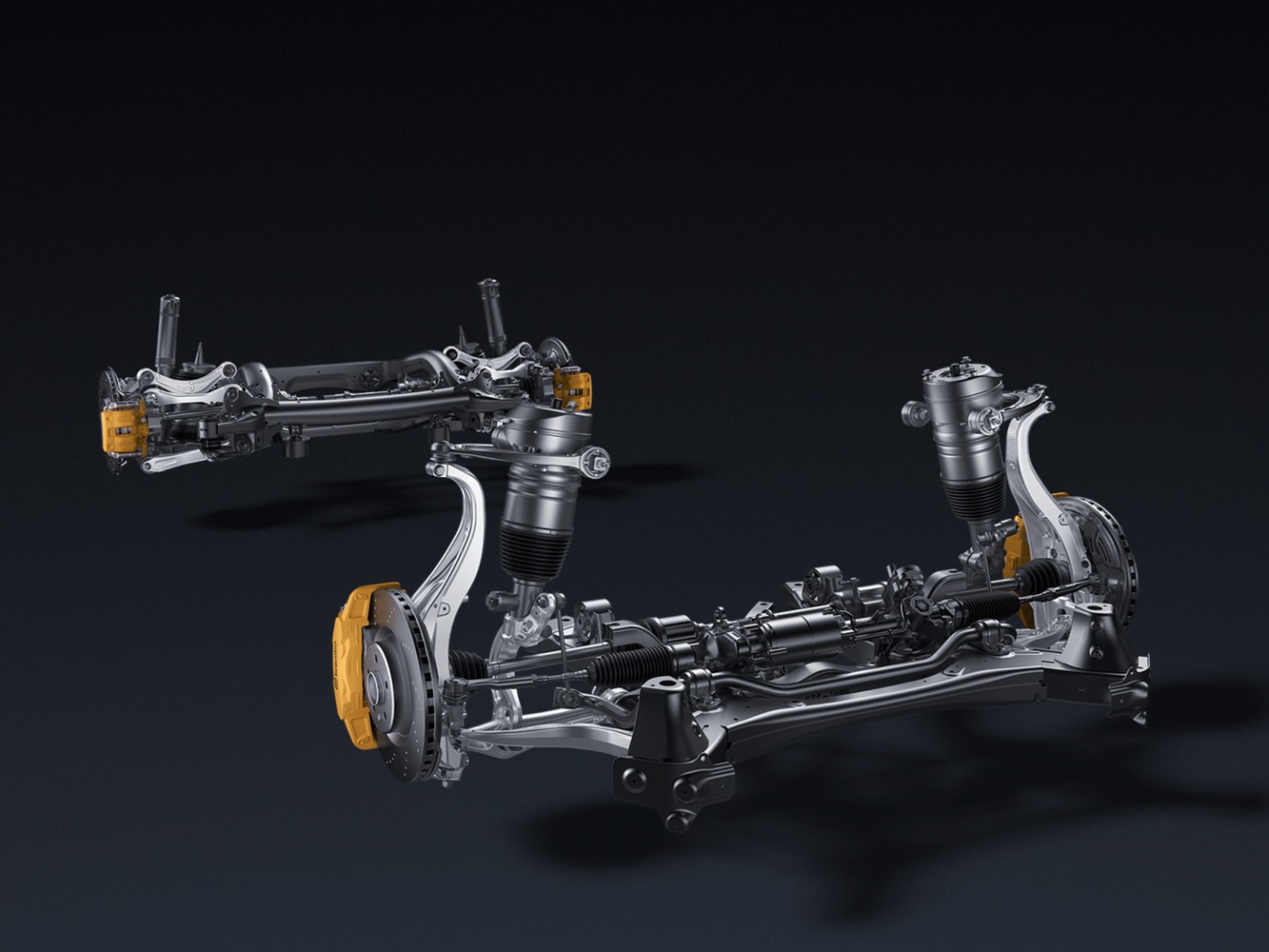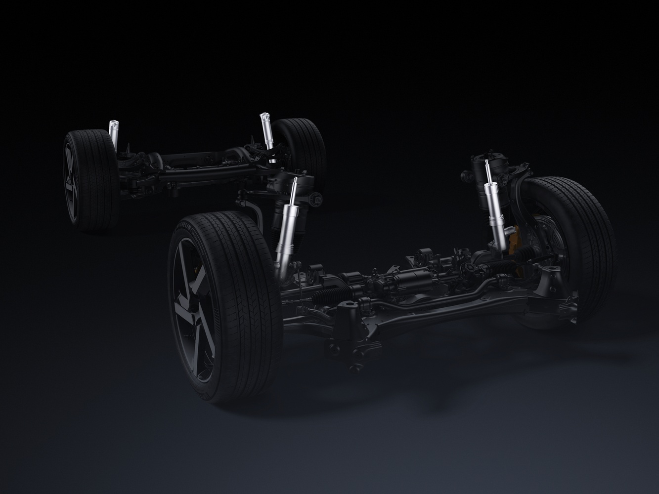- Structura suspensiei față este cu braț dublu triunghiular, iar cea posterioară este independentă cu cinci brațe.