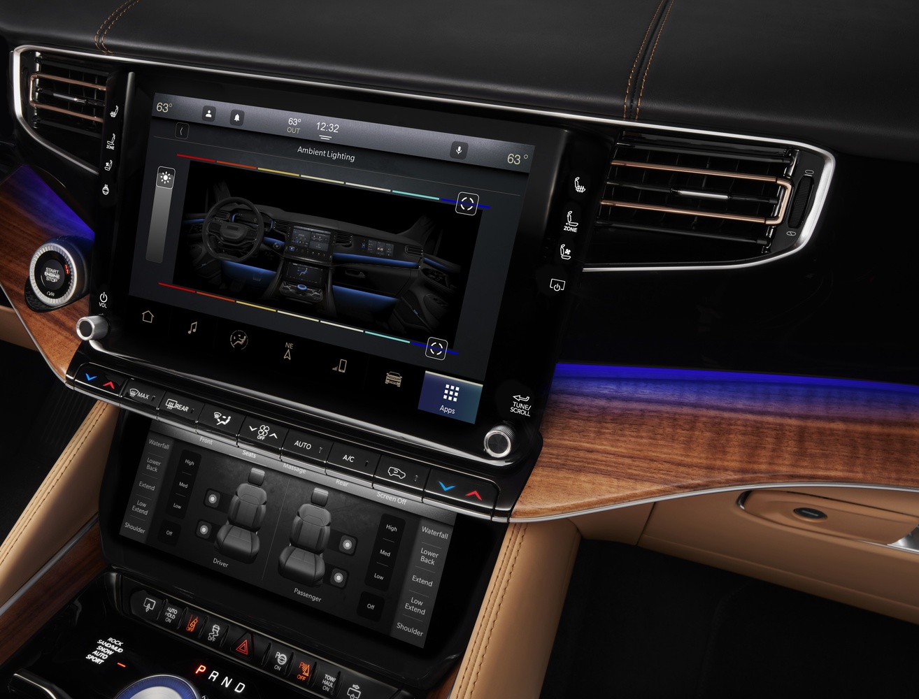 - Suprafețe scaune în piele Capri (Grand Wagoneer) sau Nappa (Limited) cu perforație Axis II; cusături Basil pentru contrast subtil în varianta Sea Salt.