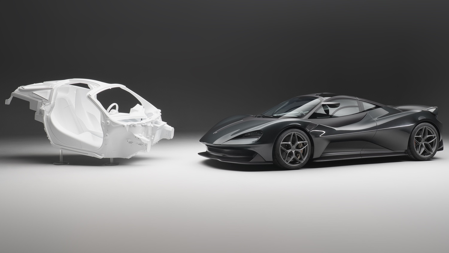 - Bazat pe construcția monococă din fibră de carbon McLaren (utilizată în P1, 720S, Senna), dar supusă reingineriei pentru a acomoda trei ocupanți.