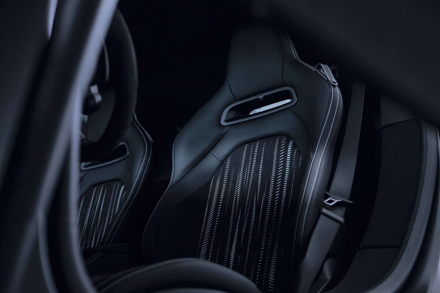 - Alcantara dominantă pe scaune, panouri uși, bord și volan, oferind aderență superioară, greutate redusă și rezistență la uzură.