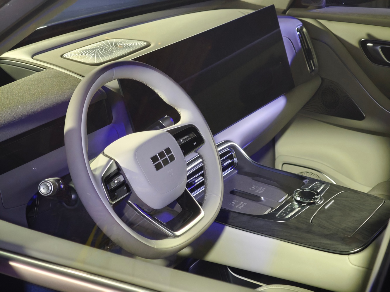 - Afișaje avansate: Ecran central de mari dimensiuni (30 inchi, rezoluție 6K), extins până la pasagerul din dreapta pentru o experiență imersivă. În spatele volanului există doar un mic ecran îngust pentru informații esențiale, dar nu lipsește un head-up display. Între ecrane există un sistem de interacțiune.
