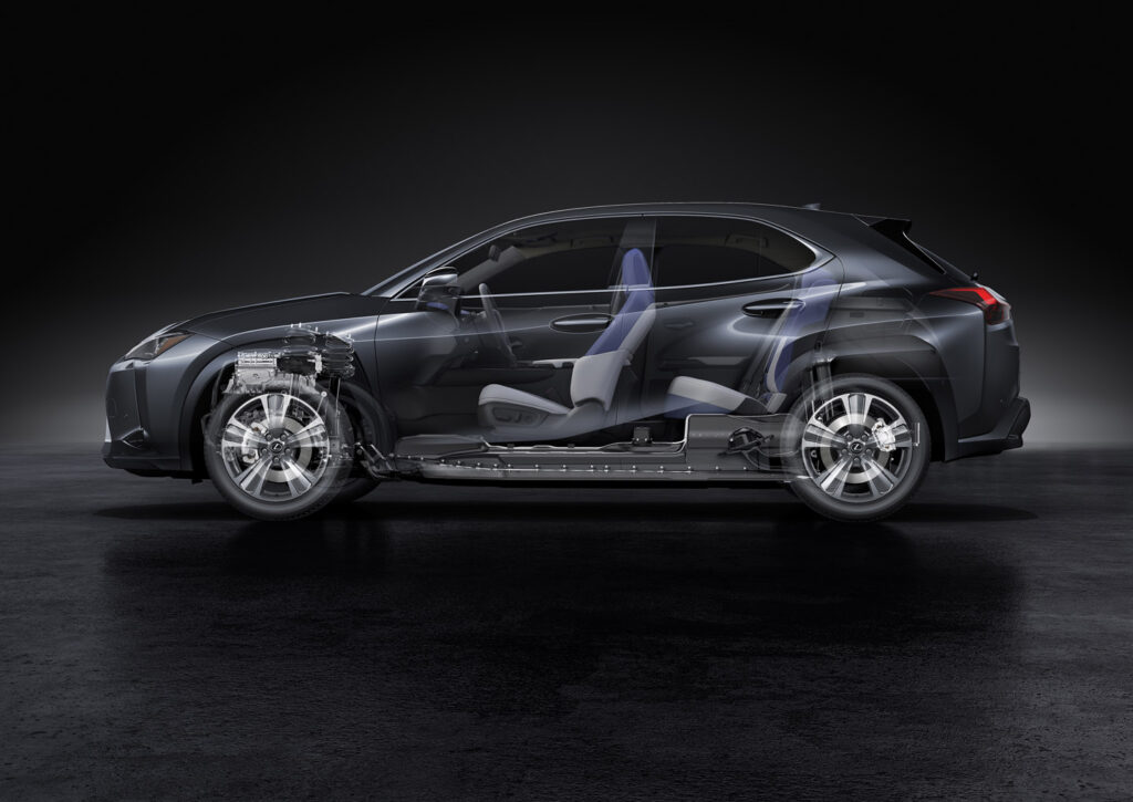 Care este deci deosebirea dintre un Lexus UX cu motorizare pe benzină sau hibridă de cea electrică, în afară de sufixul “e” în denumire? Noua platformă GA-C pe care este construit crossoverul a fost din start pregătită pentru a fi electrificată, iar acum a fost rafinată și consolidată serios pentru instalarea unei baterii.
