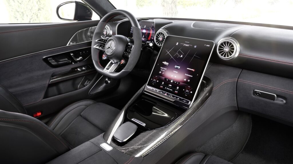 - Interiorul minimalist al modelului 300 SL Roadster, echipat cu materiale de înaltă calitate, a inspirat designerii pentru a-l face pe cel din noul model. Rezultatul este o combinație interesantă de geometrie analogică și lume digitală – numită “hyperanalogue”. Acest lucru este exemplificat de panoul de instrumente complet digital de 12.3 inci, care este integrat într-o vizieră tridimensională. Sistemul standard de infotainment MBUX oferă o gamă de mai multe stiluri de afișare specifice și moduri diferite.