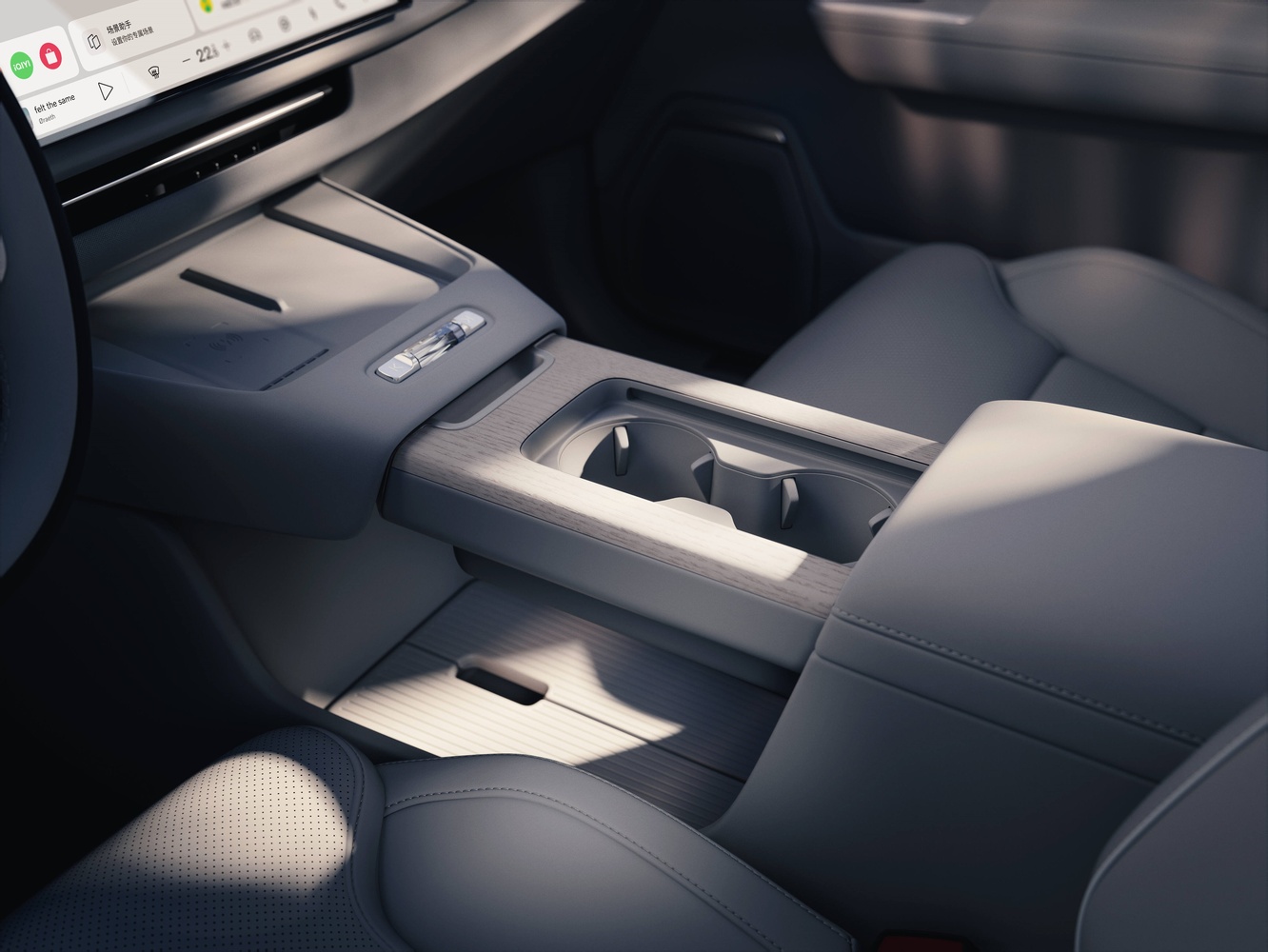 • Consola centrală culisantă întruchipează esența designului scandinav. Designul său inteligent permite compartimentarea ușoară a spațiului dintre scaunele din față sau menținerea acestuia deschis. O husă din lemn natural se glisează de sub cotiera centrală față și se conectează la raftul consolei centrale față, creând un spațiu de depozitare elegant, cu o măsuță culisantă luxoasă care acoperă cele două suporturi pentru pahare de dedesubt.