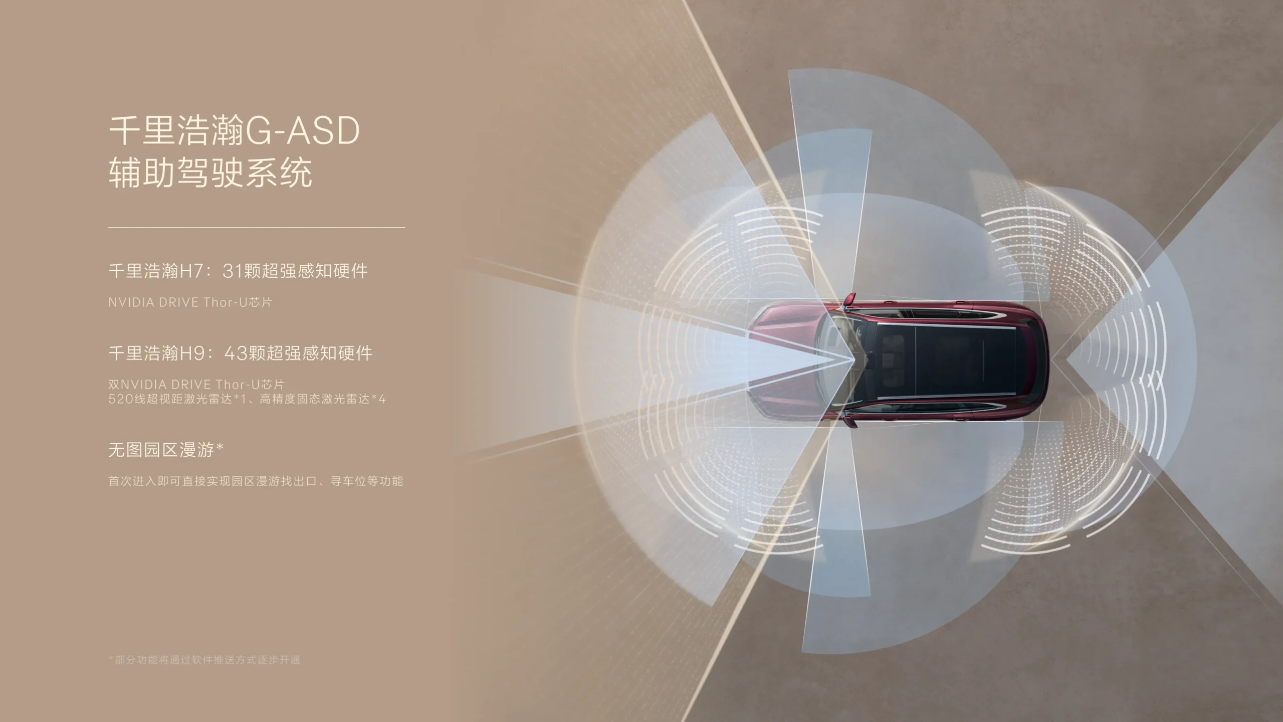 • Opțional indiferent de echipare G-Pilot H9: cinci LiDAR-uri și două procesoare Thor-U (1400 TOPS) pe lângă alți senzori.