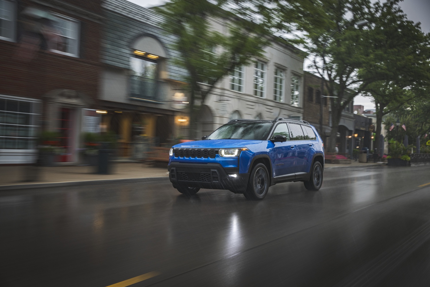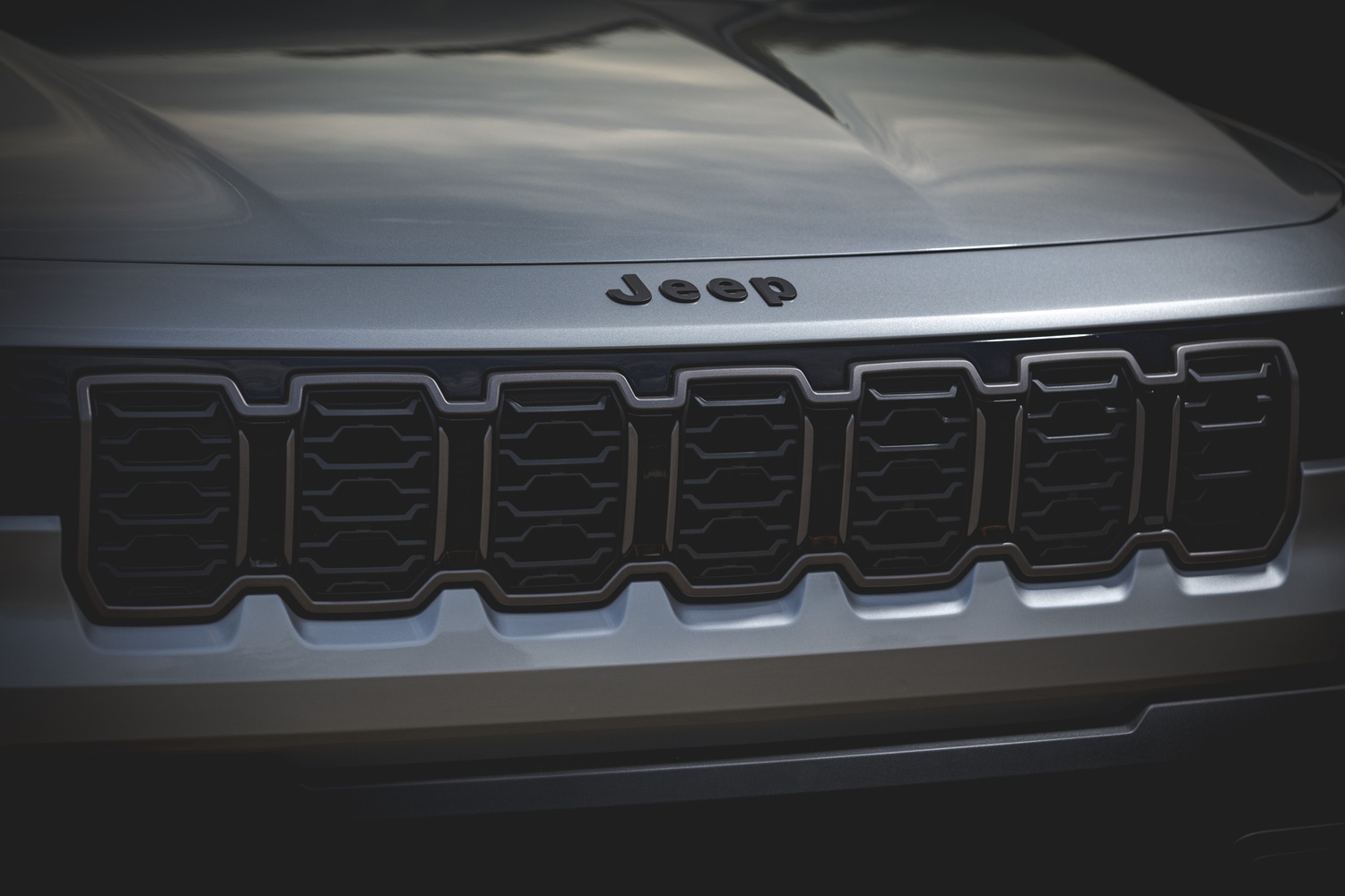 - Grilă iconică Jeep cu șapte fante, pătrată și robustă, flancată de faruri LED subțiri cu lumini de zi în formă de U.