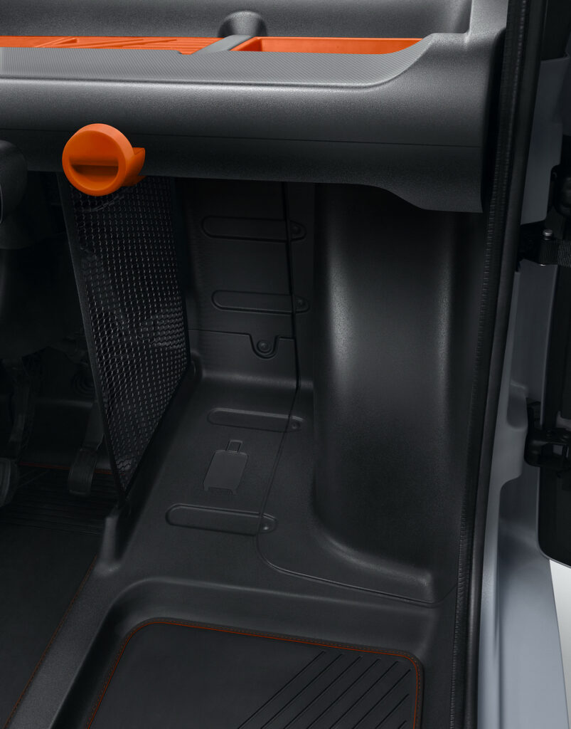 - De asemenea, habitaclul beneficiază de raționalizarea numărului de materiale și elemente, în conformitate cu gândirea inteligentă din centrul procesului de proiectare. În poziția de conducere, ochiul este atras de modelul verificat folosit pentru afișarea panoului de instrumente situat pe coloana de direcție, împrumutat de la AMI ONE Concept care afișează informații relevante pentru citirea instantanee. În dreapta volanului există o zonă dedicată pentru găzduirea unui smartphone, care devine ecranul principal al tabloului de bord și oferă acces la navigație și muzică.