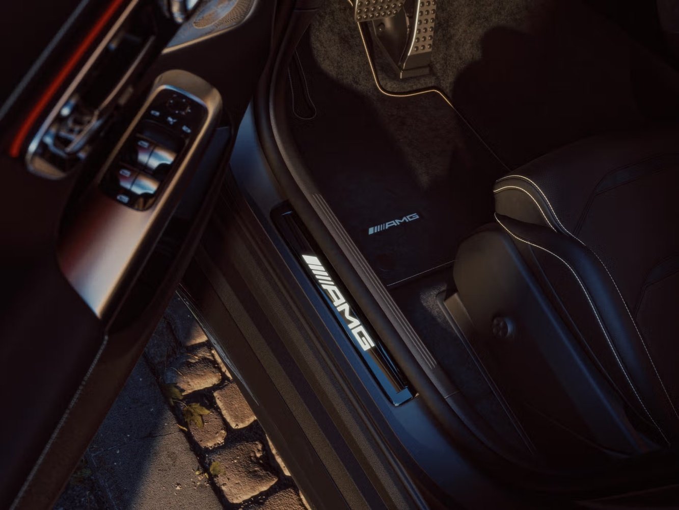 - Interior: scaune sport AMG în piele neagră cu cusături contrast techgold, bord și panouri uși cu cusături de contrast, elemente din fibră de carbon cu fire metalice, praguri iluminate, covorașe AMG cu cusături bej.