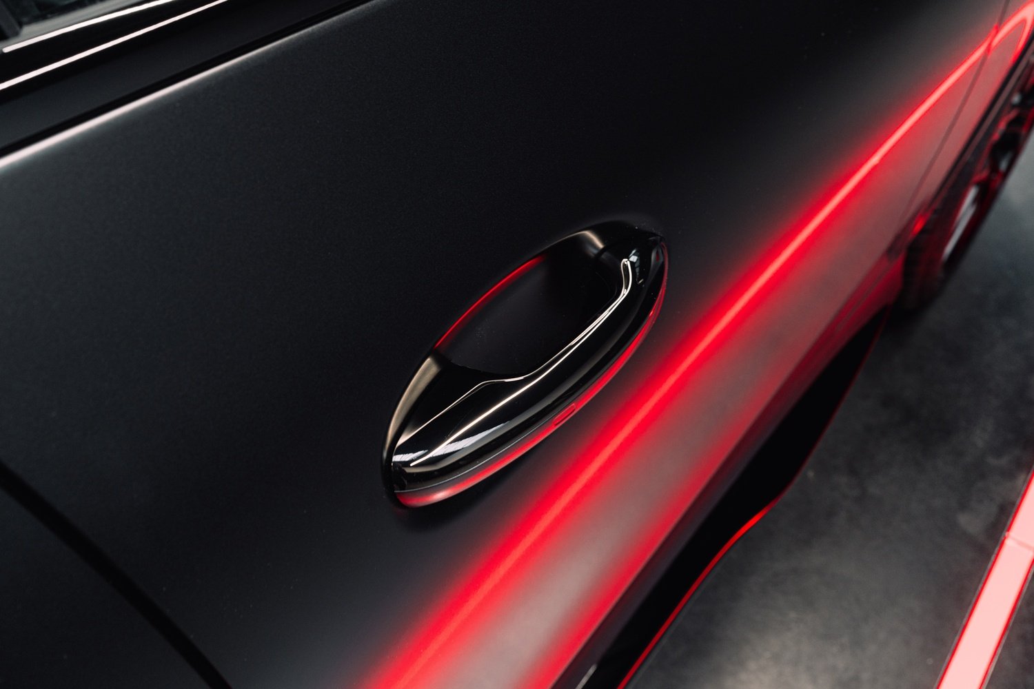 - O altă caracteristică distinctivă opțională este folia subtilă de pe flancurile mașinii, cu logoul AMG.