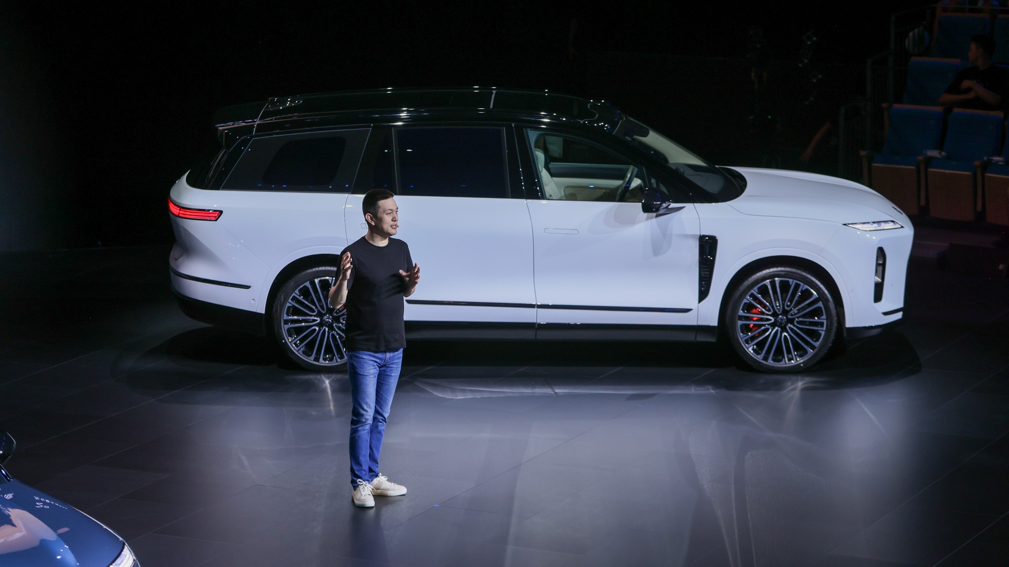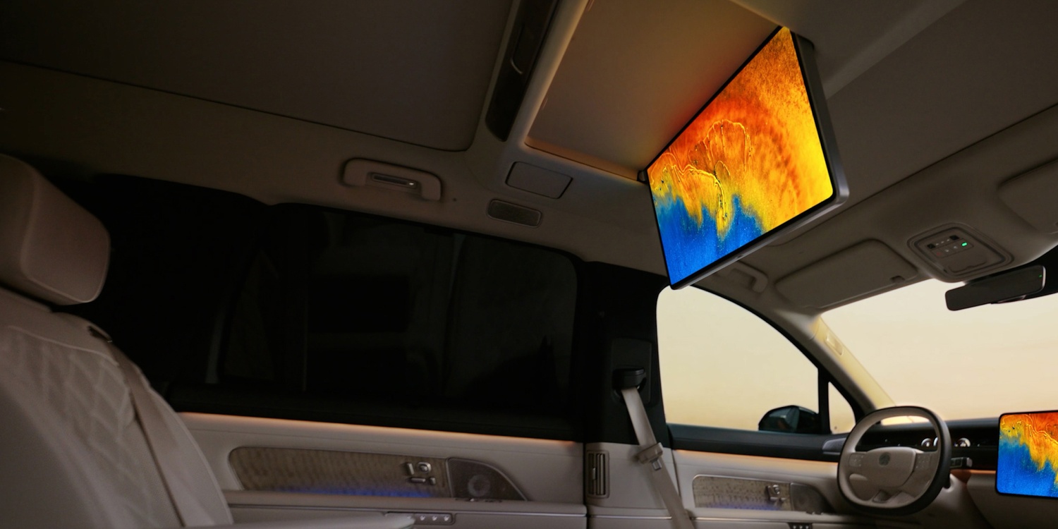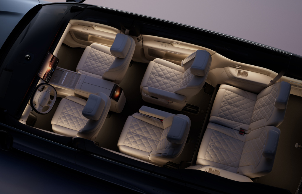 • Ecran spate prin de tavan mini-LED de 21.4 inchi (Dolby Vision, HDR Vivid, contrast 1.000.000:1, fără lumină albastră). O singură atingere pentru a activa modul Theater și a transforma scaunul din dreapta al rândului al doilea, cu gravitație zero, într-o poziție de vizionare optimă, certificată MPA. Lansat la nivel mondial, efectul de iluminare ambientală fluidă dansează dinamic în sincronizare cu imaginile de pe ecran, oferind pasagerilor o experiență multisenzorială.