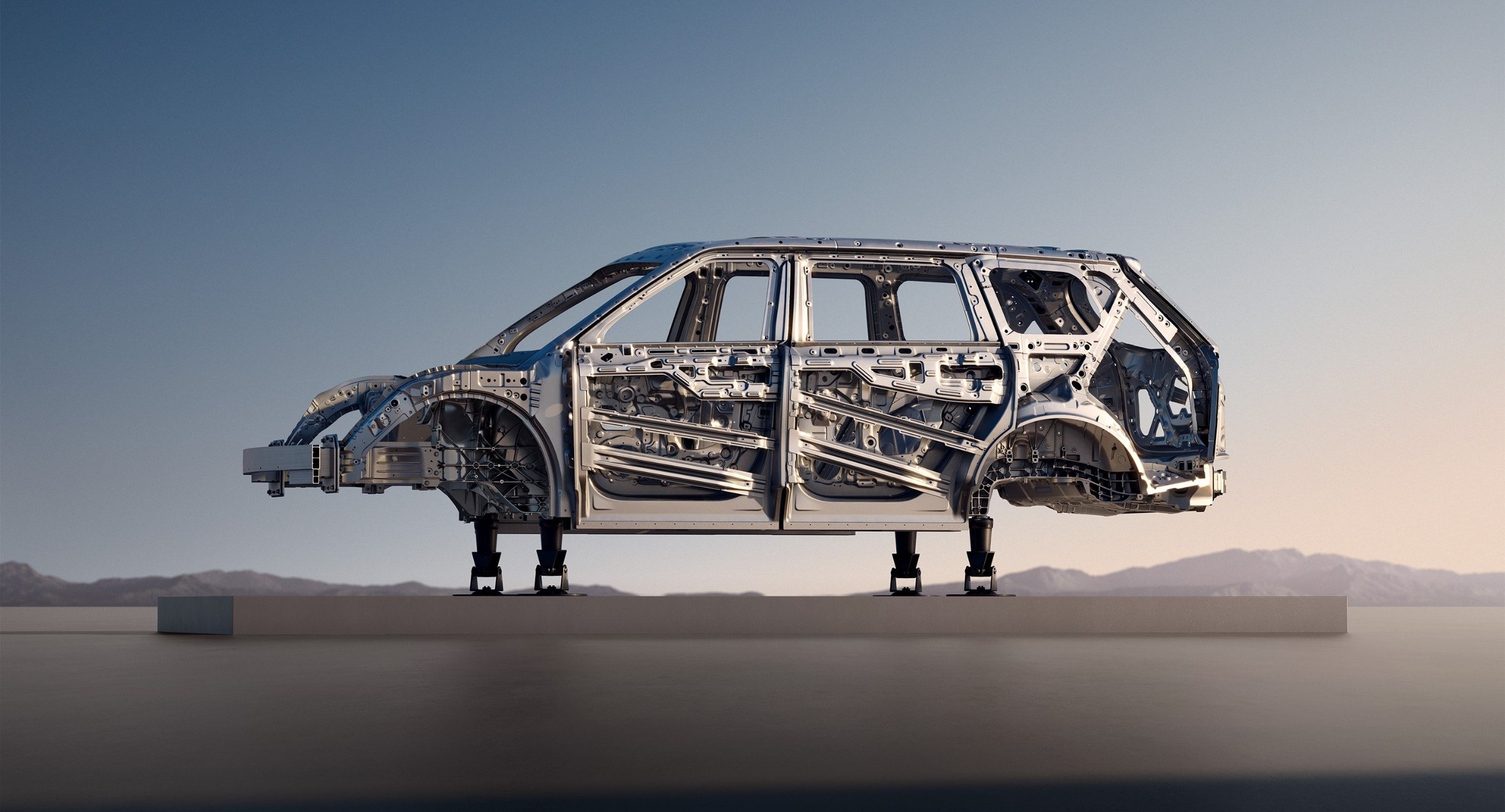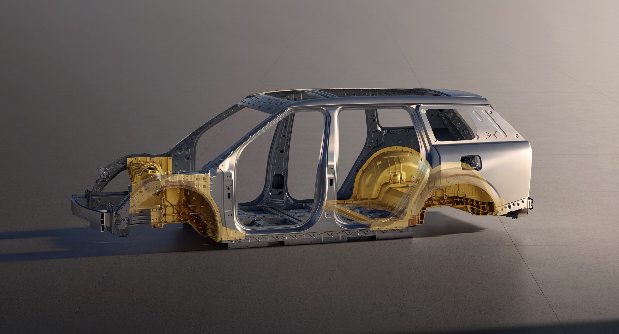 - Subcadru frontal și posterior turnate monobloc din aluminiu (integral die-casting cu o presă industrială de 16.000 de tone) – cele mai mari din industrie