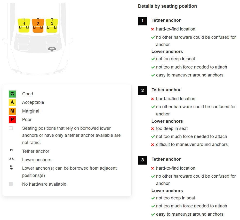 Toate ancorajele de prindere sunt situate pe peretele din spate, sunt greu de găsit, dar nu există hardware confuz și nu au etichete contrastante în apropiere. Ancorajele pot fi accesate doar cu poziționarea corectă a spătarului scaunelor.