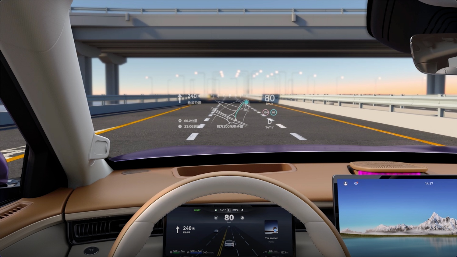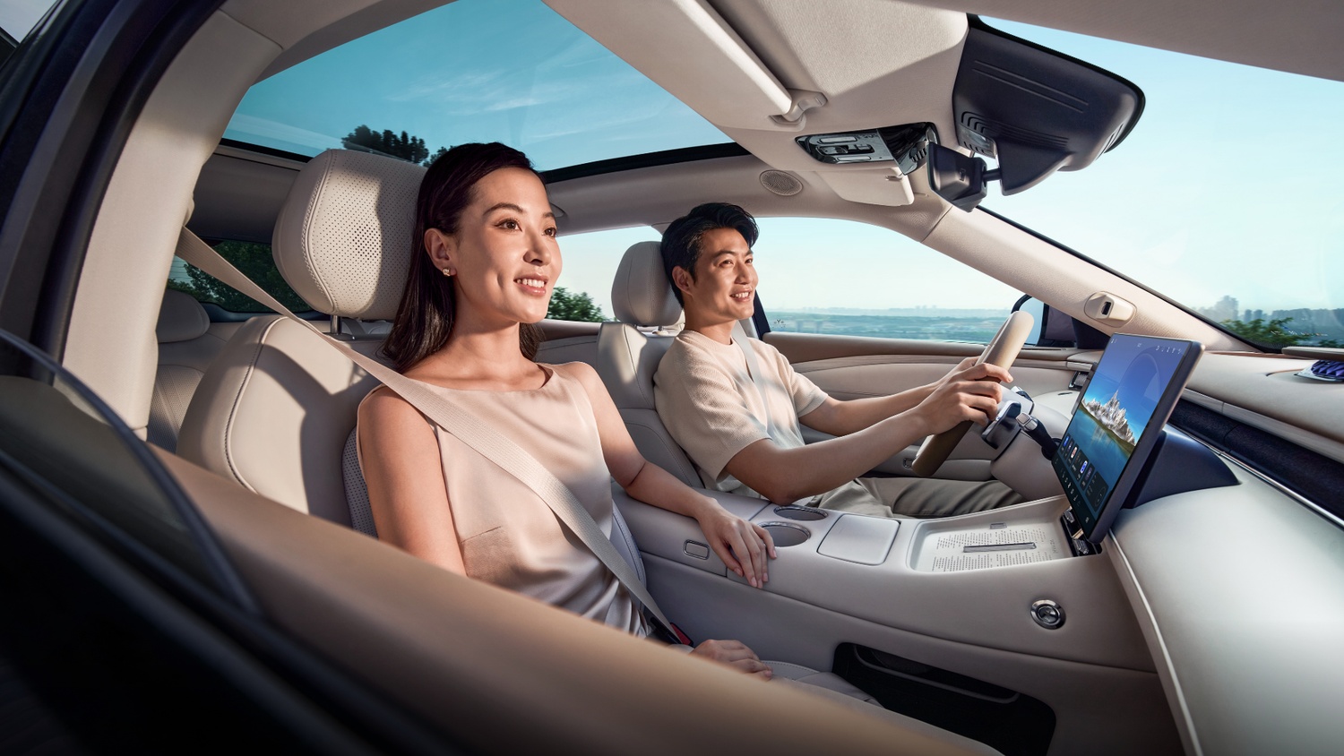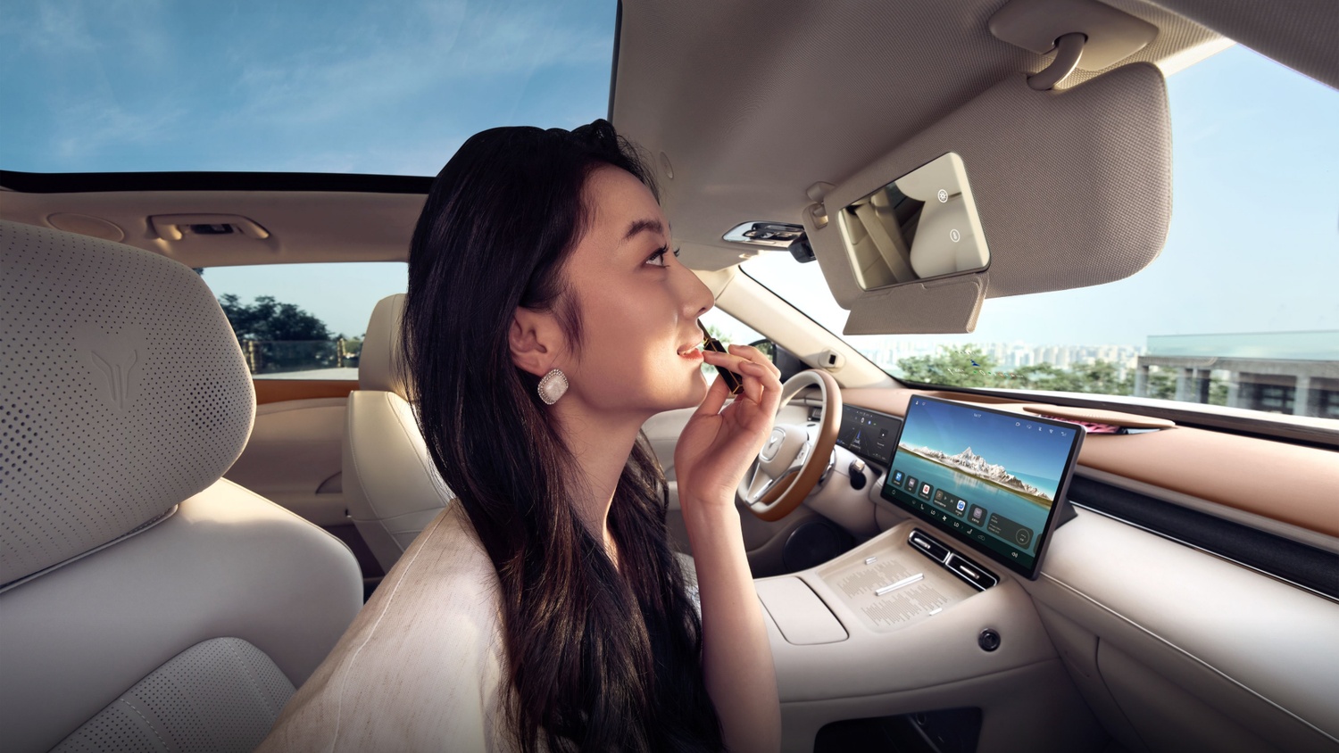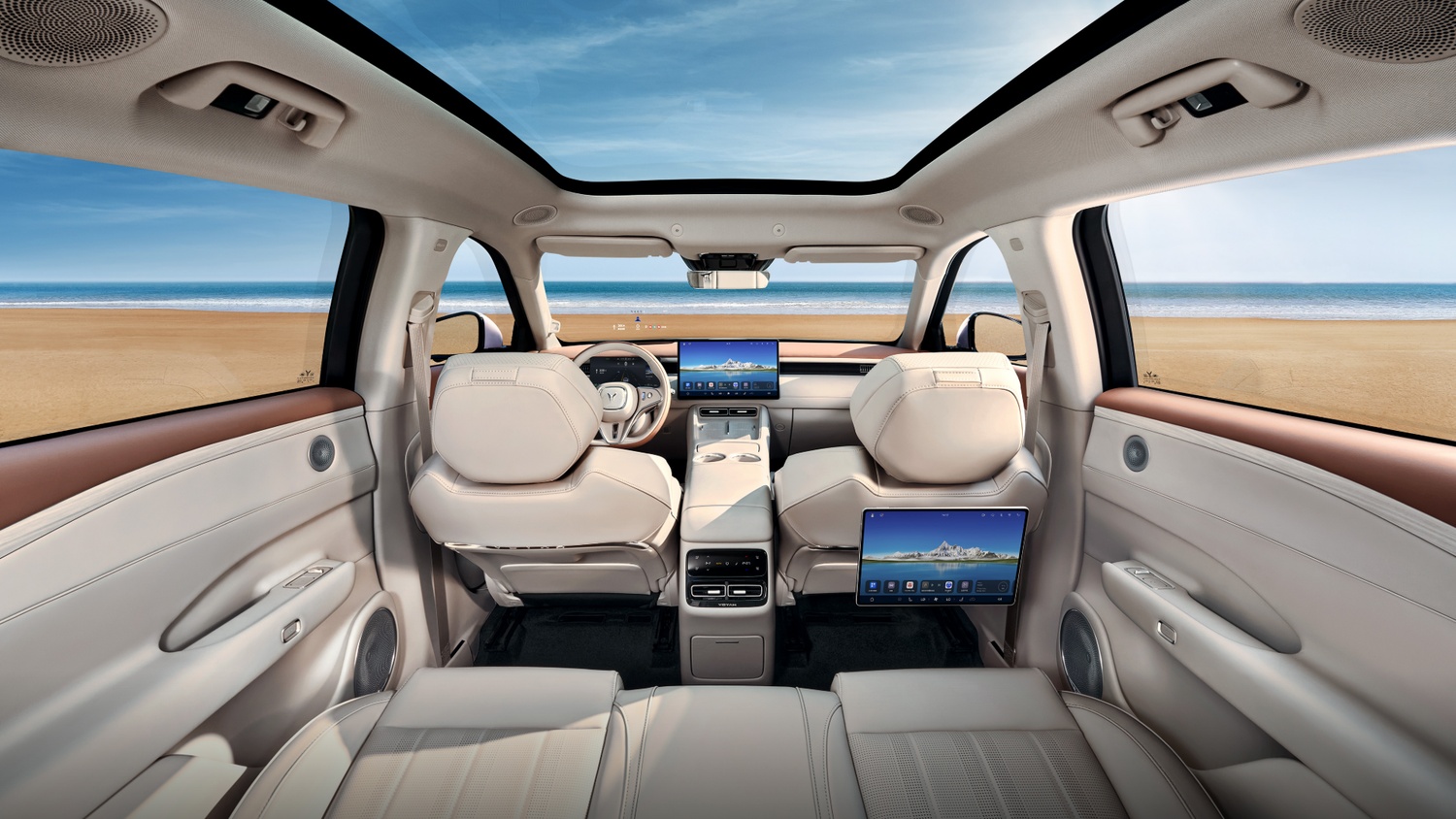 • Din echipament mai poate face parte: un head-up display cu realitate augmentată de 29 inci (tot marca Huawei, cu peste 15000 niți luminozitate), două încărcătoare wireless de 50 W, un asistent vocal, sistem audio cu 22 de difuzoare (inclusiv în tetierele frontale), sistem de climatizare automată pe trei zone, un plafon panoramic de 1.78 metri pătrați cu parasolar electric, iluminare ambientală în 256 culori, priză la 220V, etc.