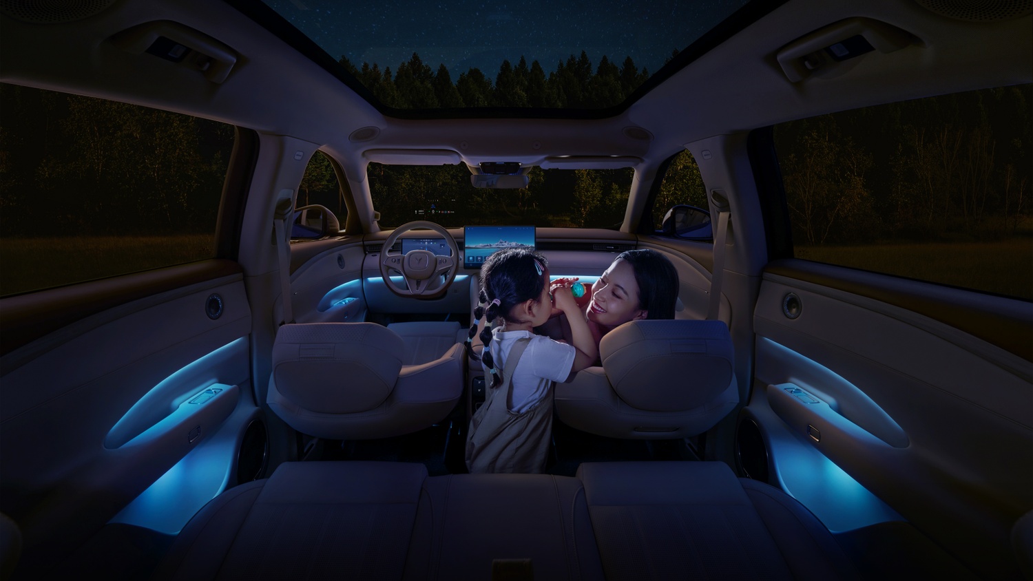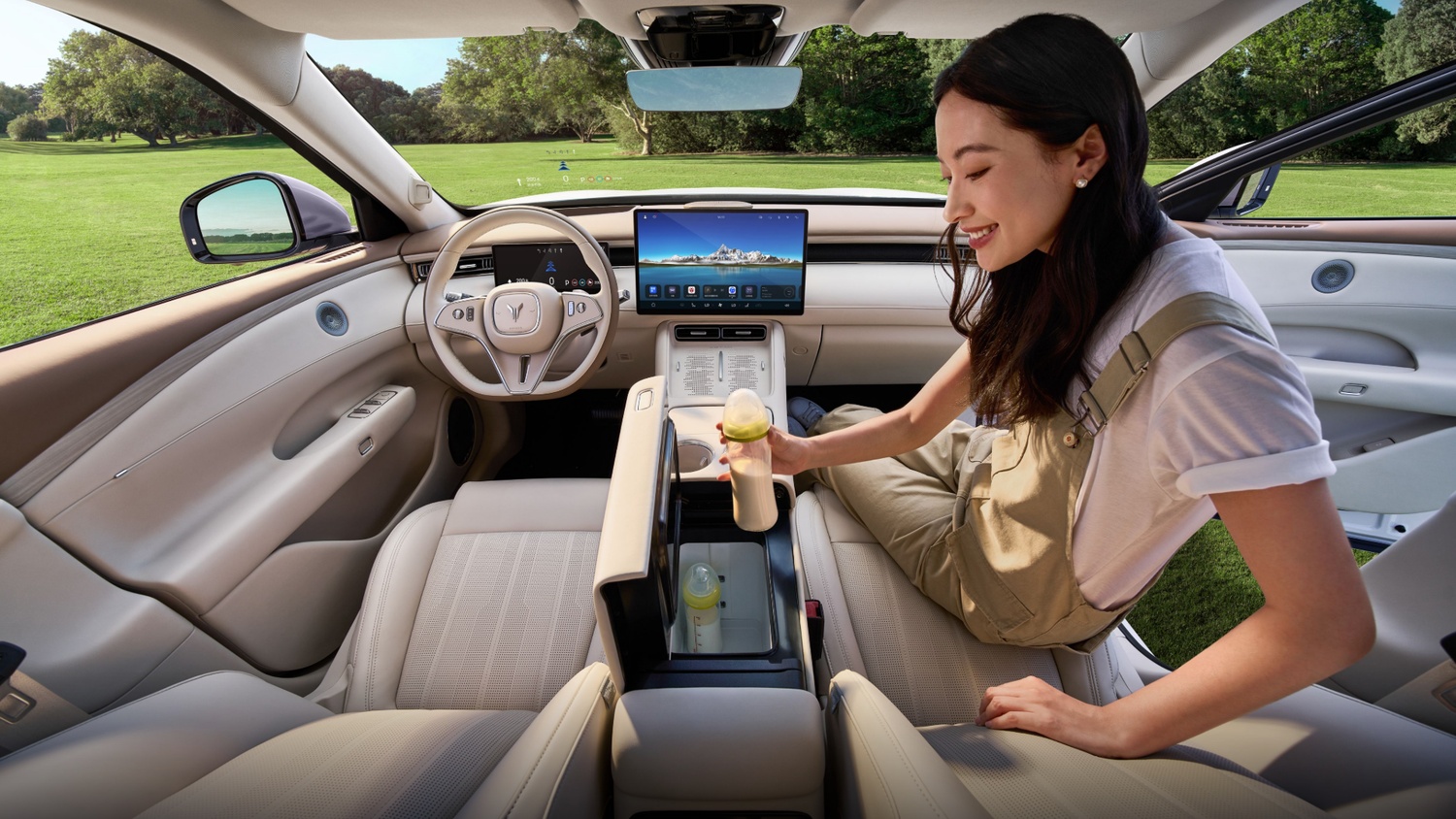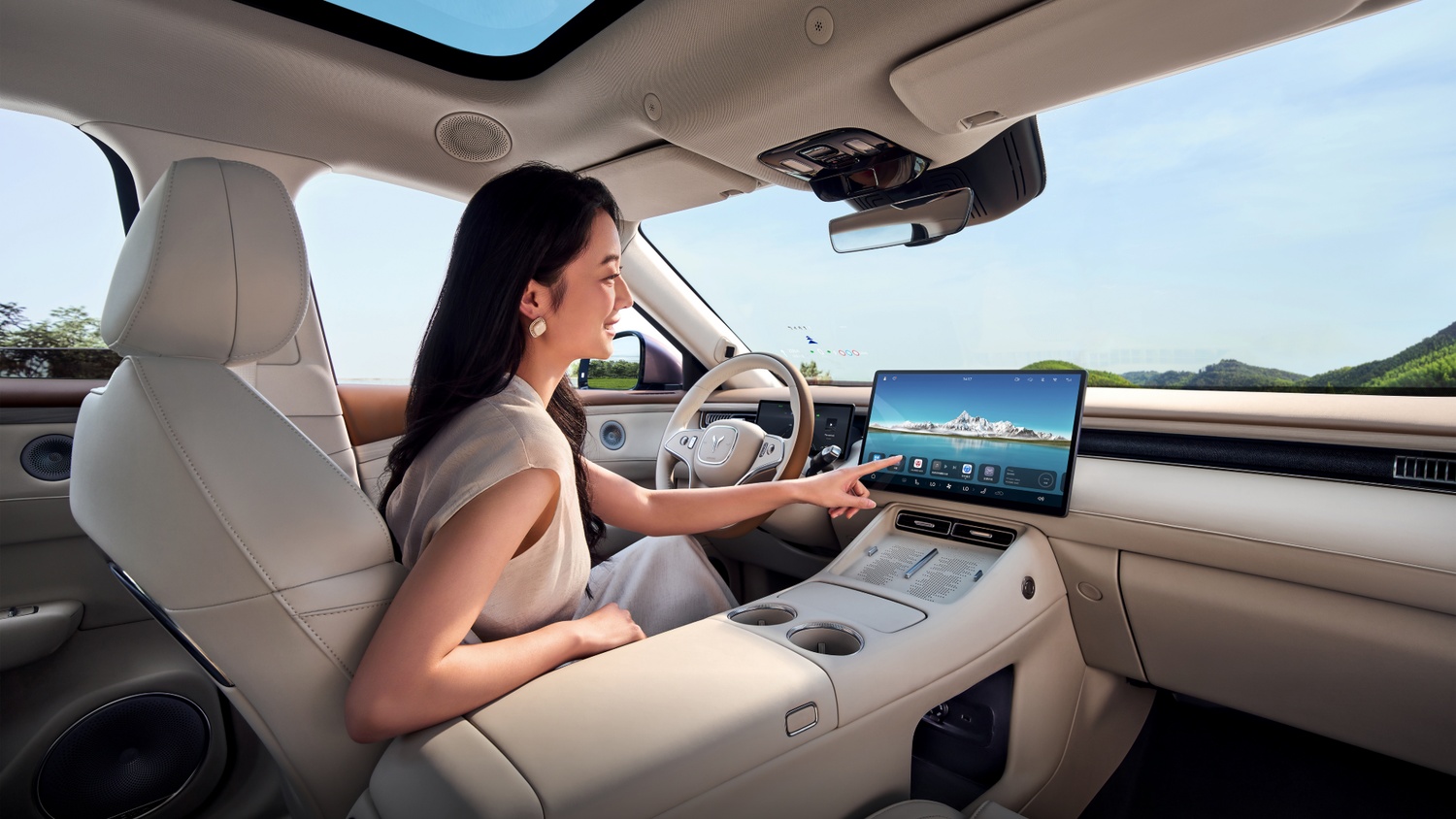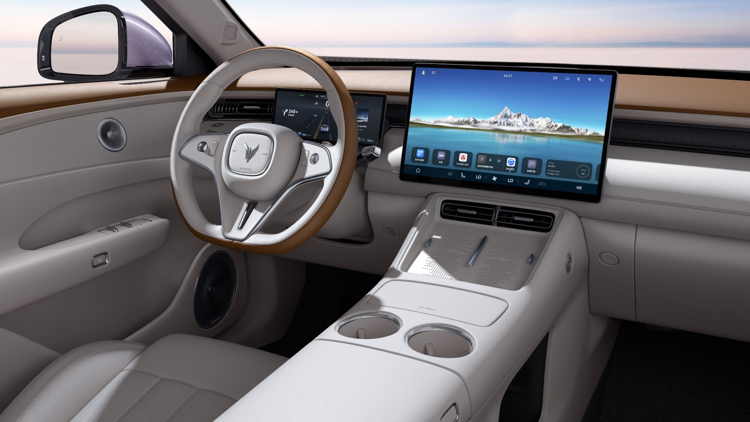 • Cu startul perioadei de presale a fost dezvăluit și interiorul mașinii pentru prima dată în imagini oficiale, căci la Auto Shanghai geamurile erau umbrite. Marea noutate – o planșă de bord complet modificată. Locul a trei ecrane înguste a luat unul dedicat pentru instrumente și altul dedicat de 15.6 inchi pentru multimedia. În loc de sistemul proprietar s-a ales Harmony OS 5, tot mai popular în preferințele clienților.