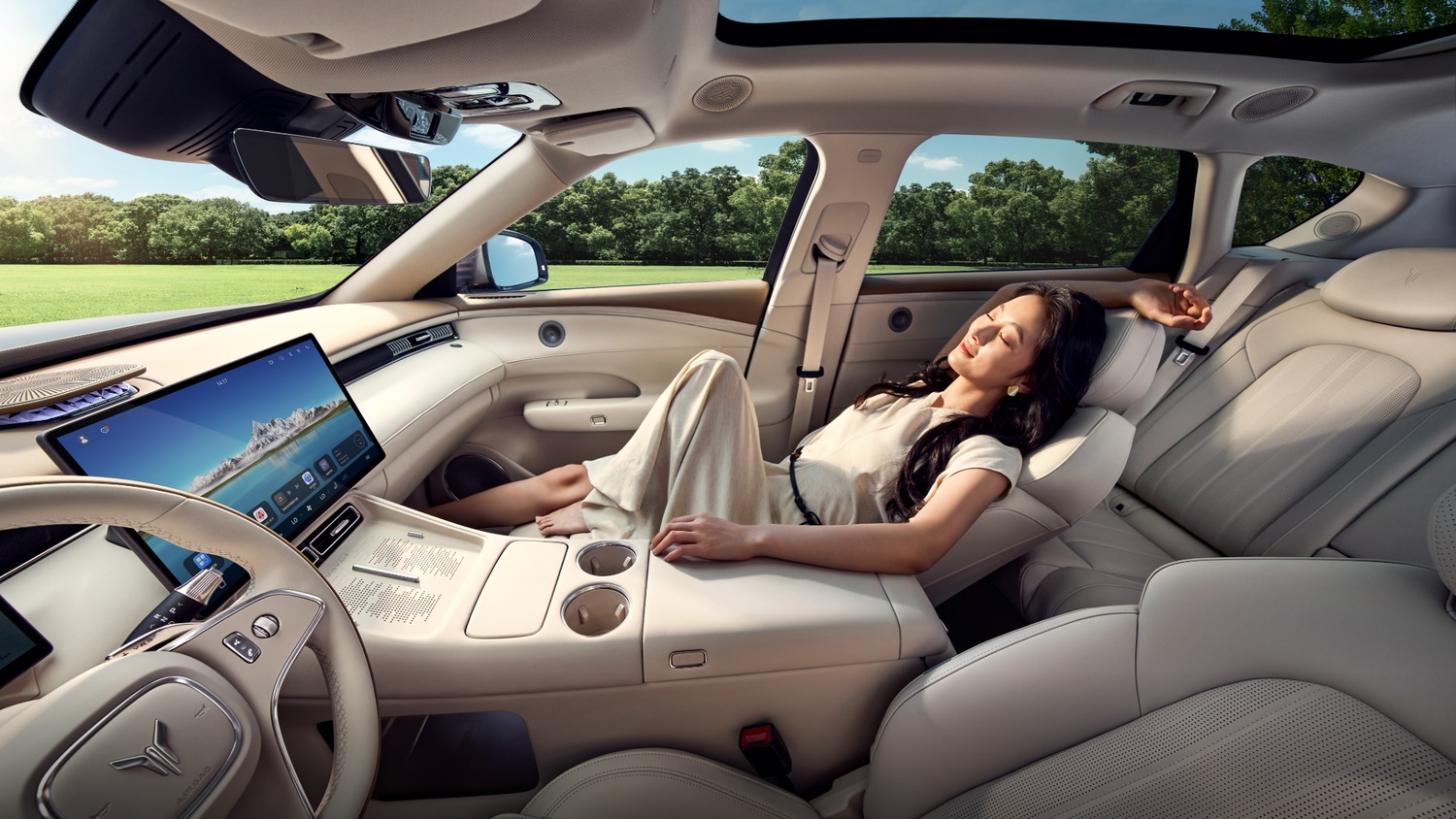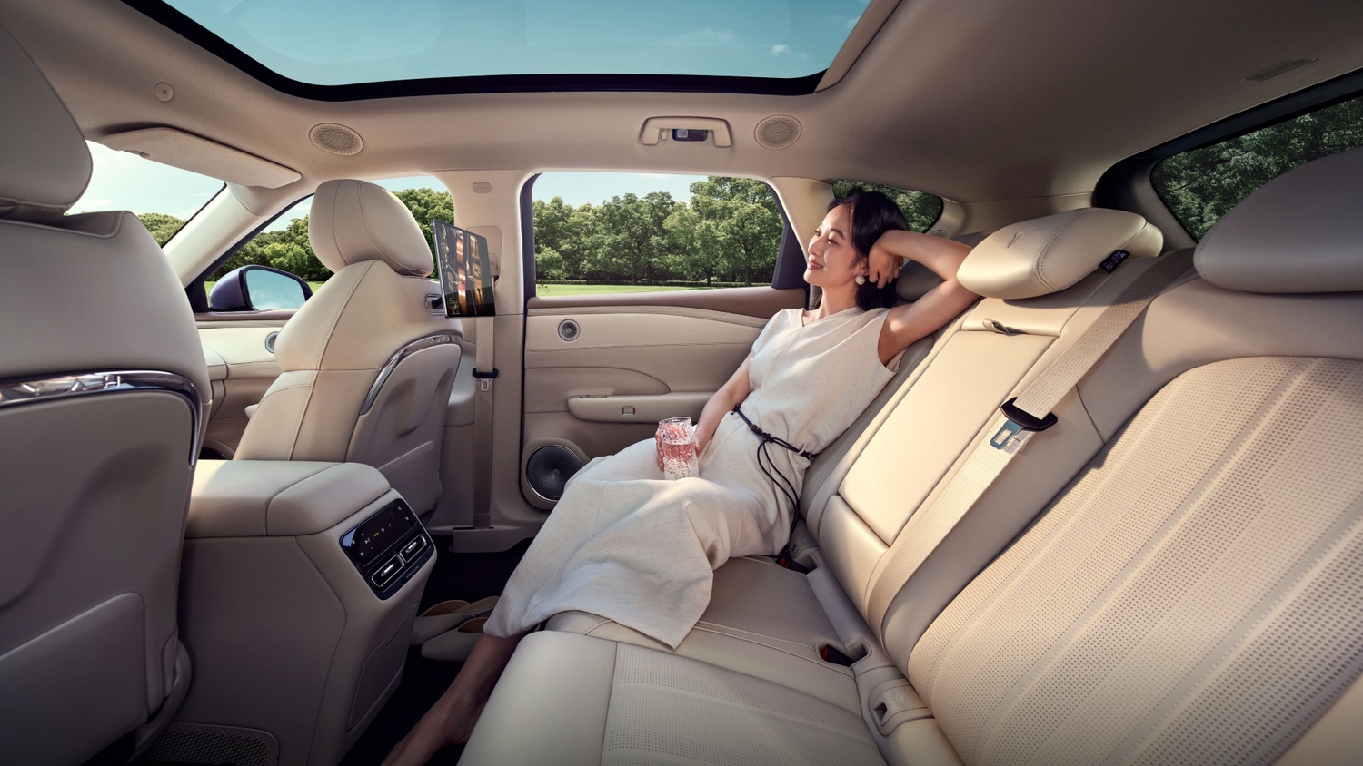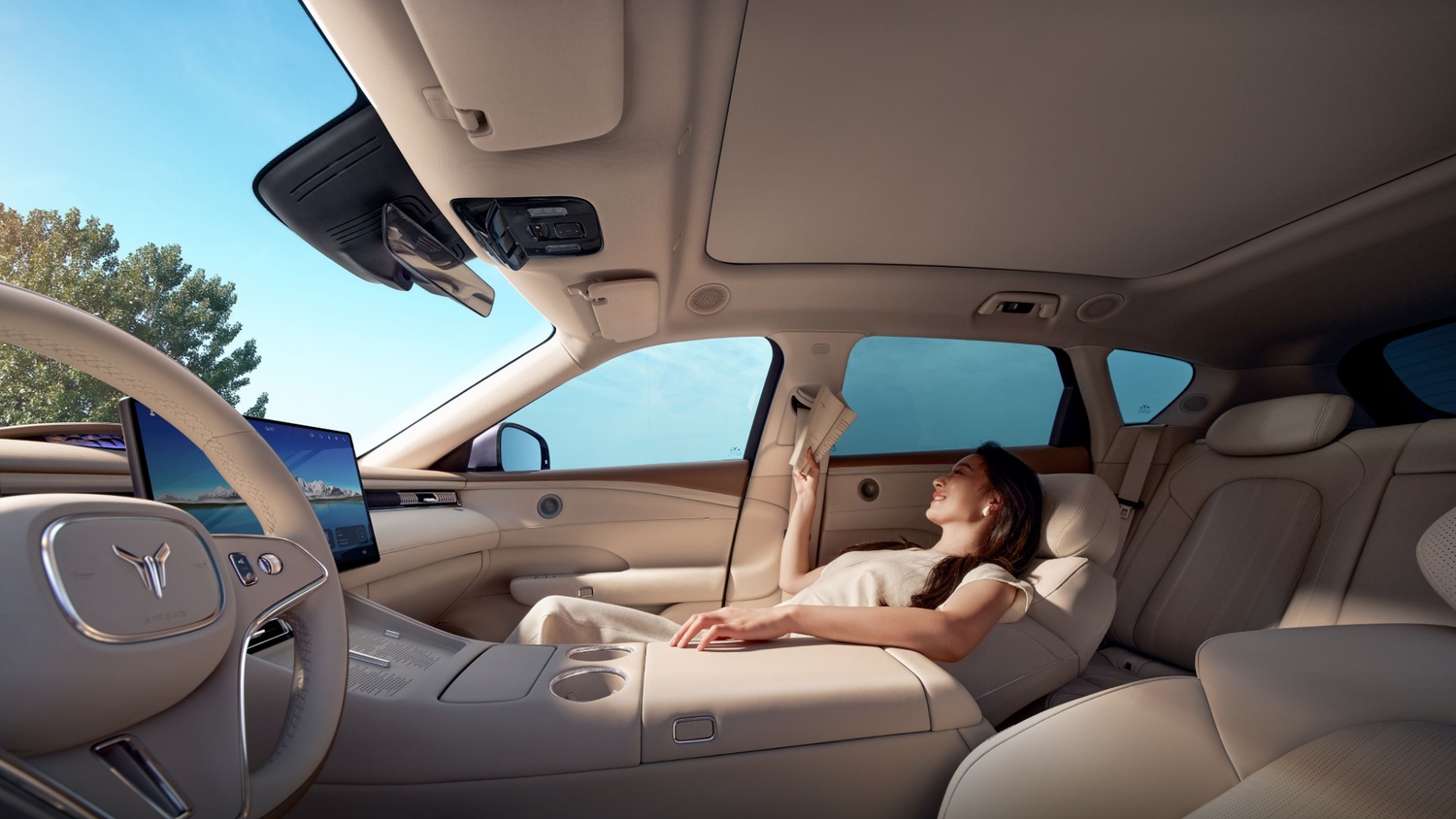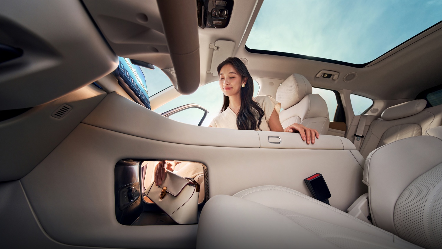 • Pasagerii au acces la o cutie de depozitare de 7 litri cu funcții de încălzire și răcire, scaune frontale multifuncționale cu masaj (al pasagerului cu funcție Zero Gravity) și banchetă posterioară cu unghi de înclinare pe un interval de 27 de grade (până la 129 de grade).