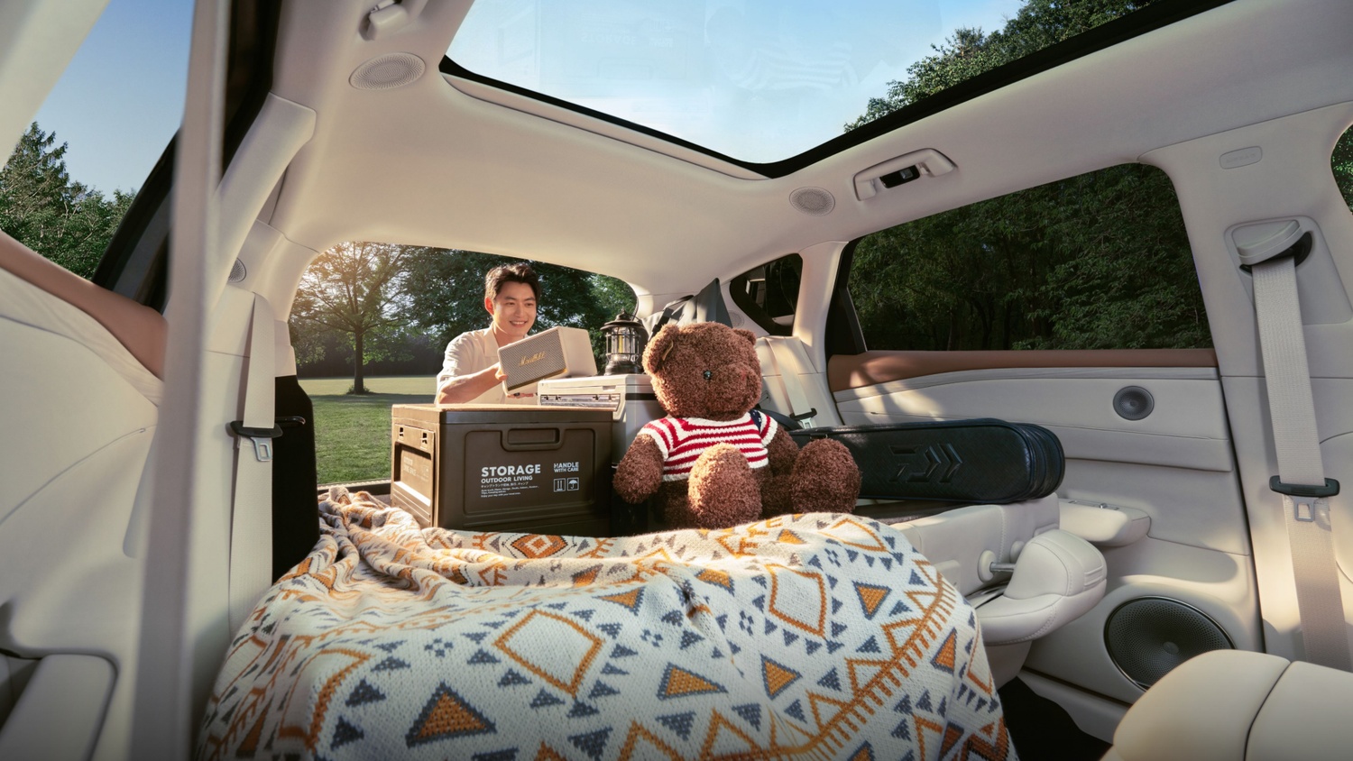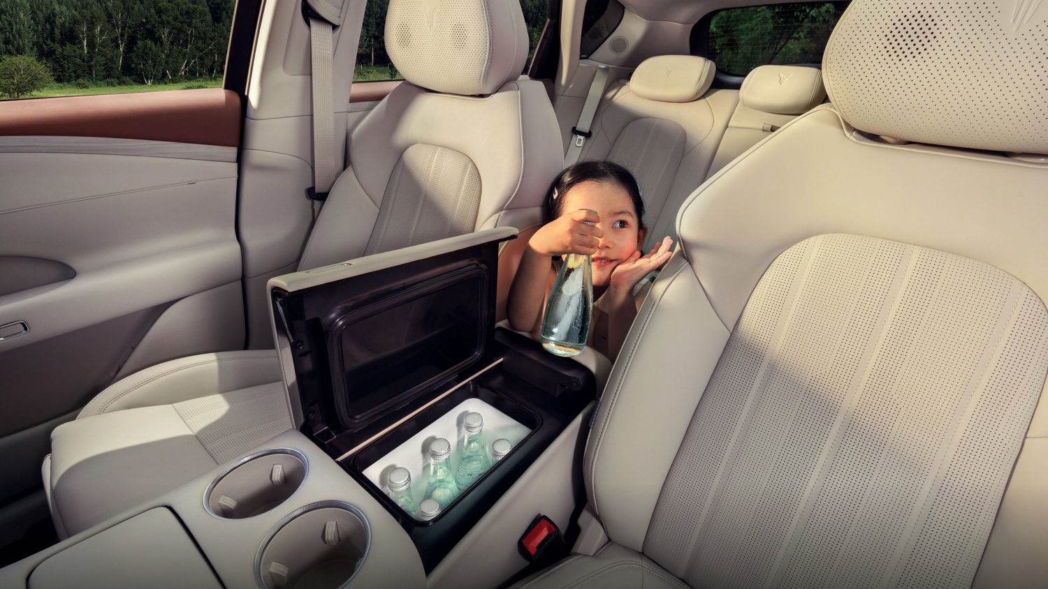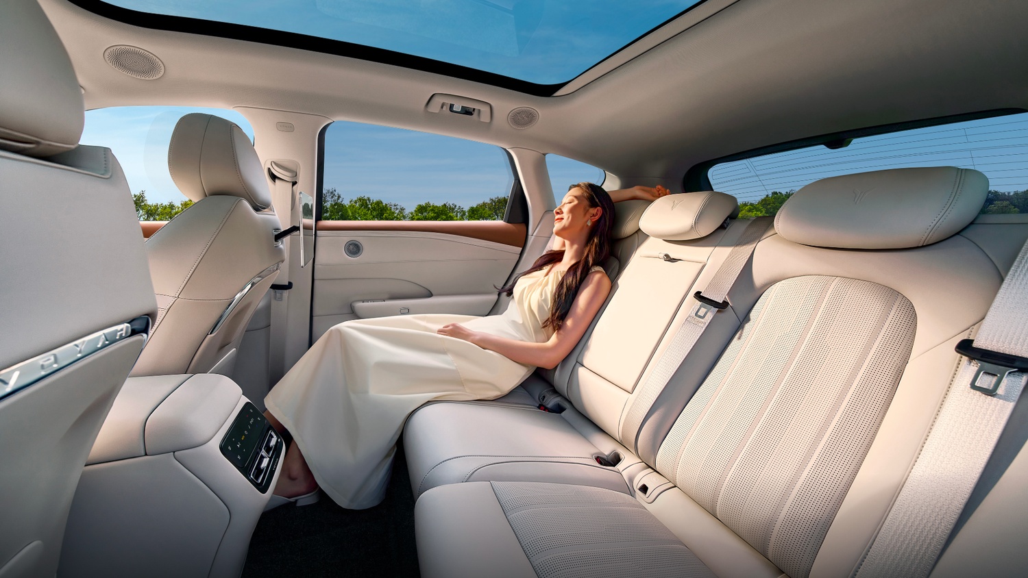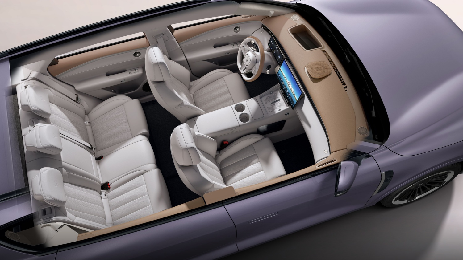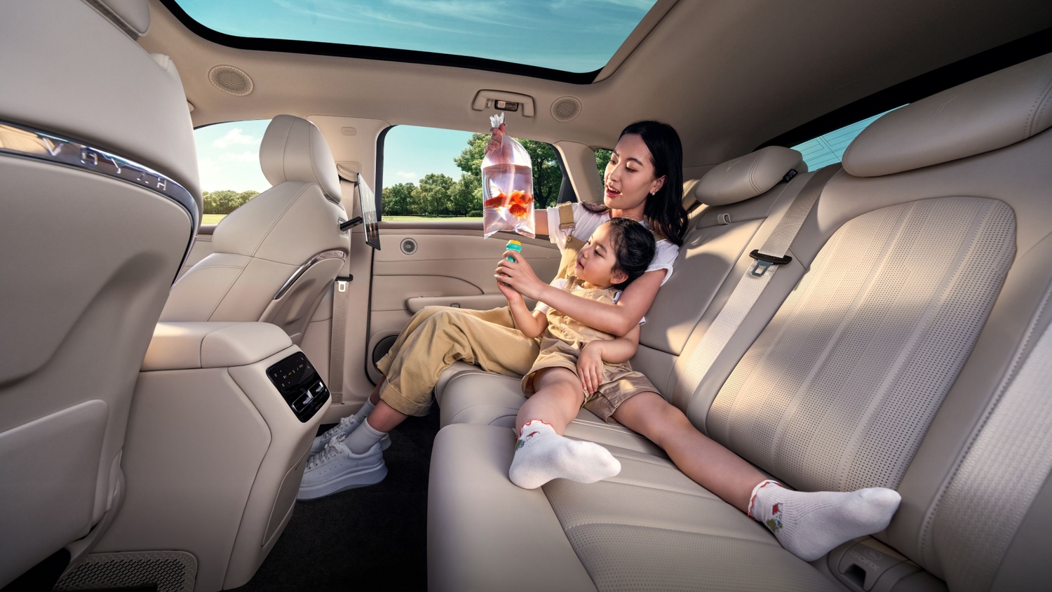 • Pasagerii au acces la o cutie de depozitare de 7 litri cu funcții de încălzire și răcire, scaune frontale multifuncționale cu masaj (al pasagerului cu funcție Zero Gravity) și banchetă posterioară cu unghi de înclinare pe un interval de 27 de grade (până la 129 de grade).