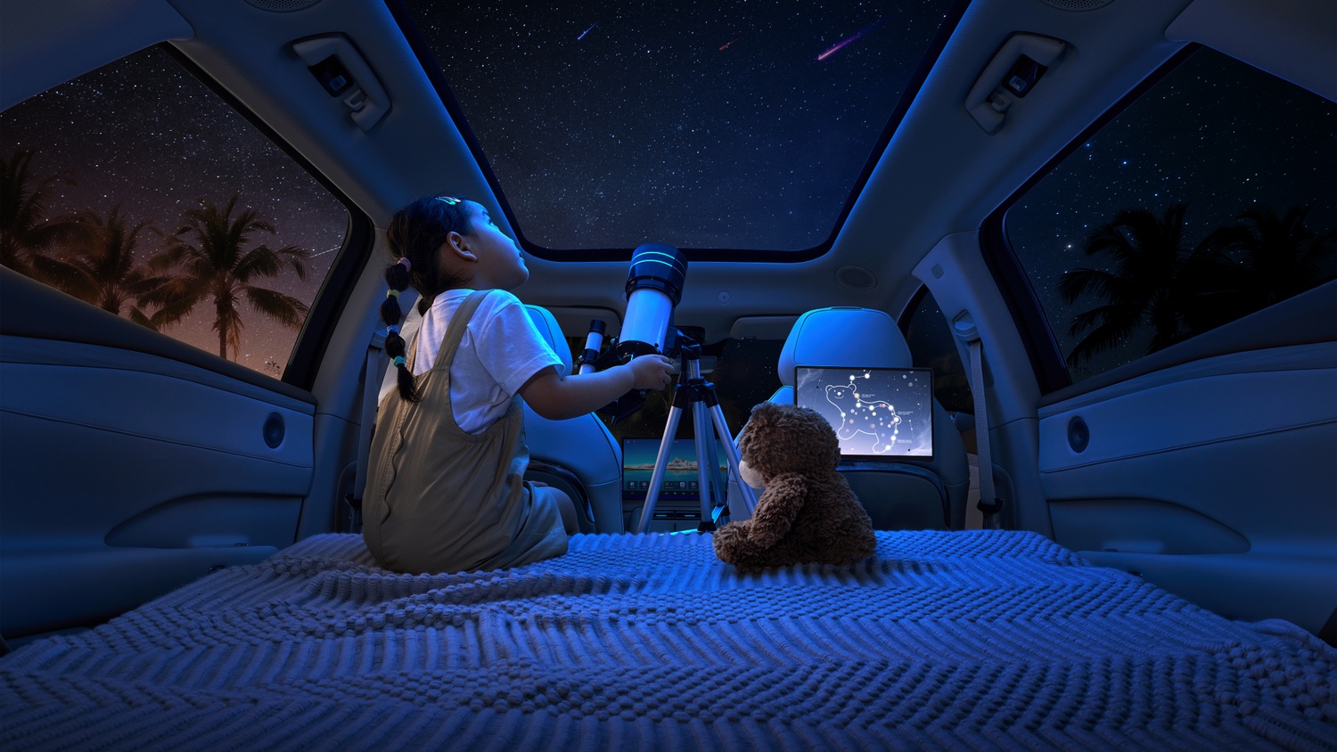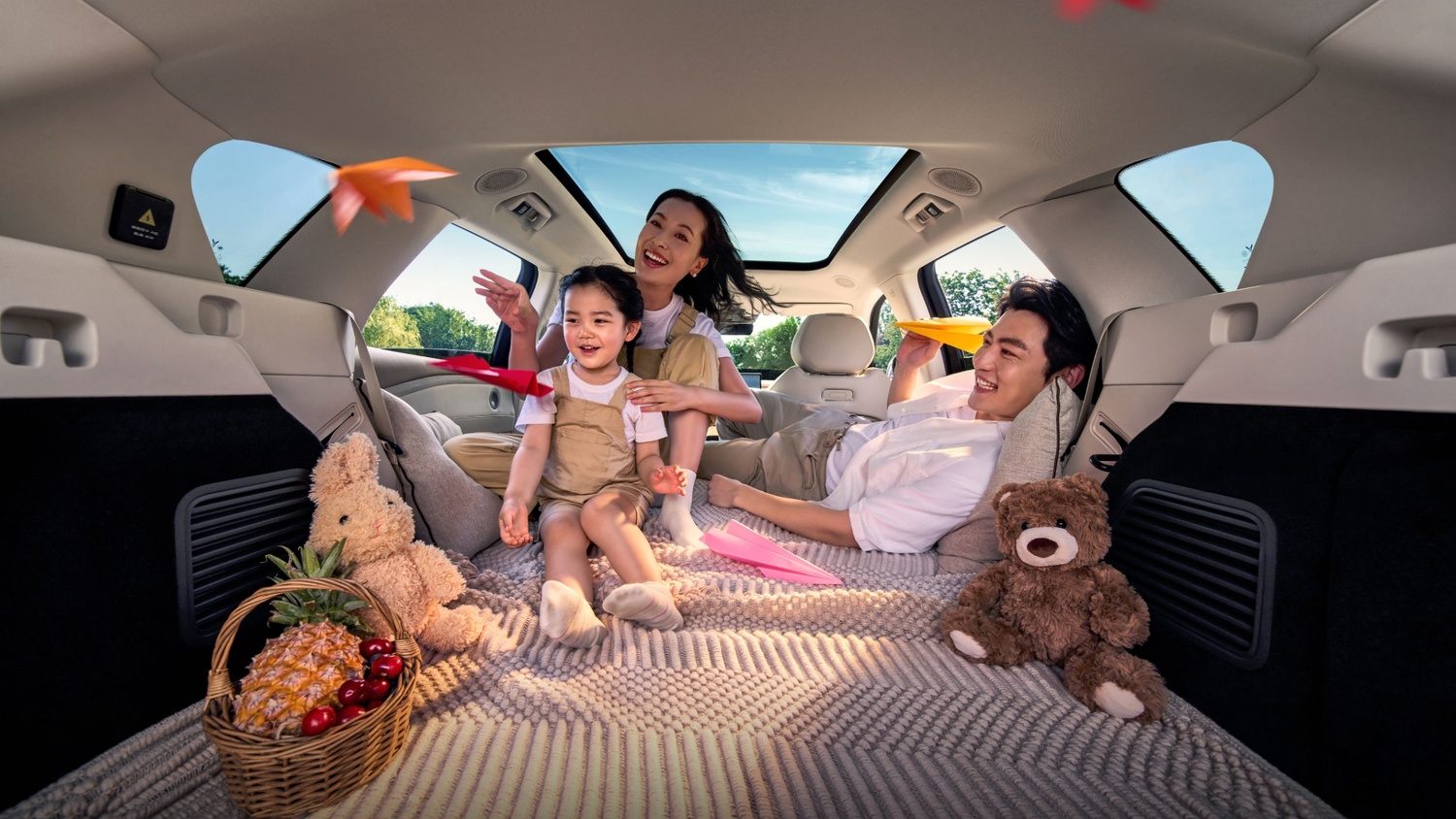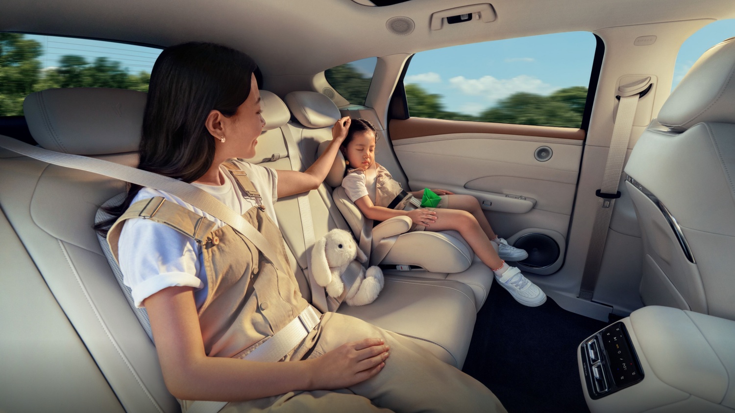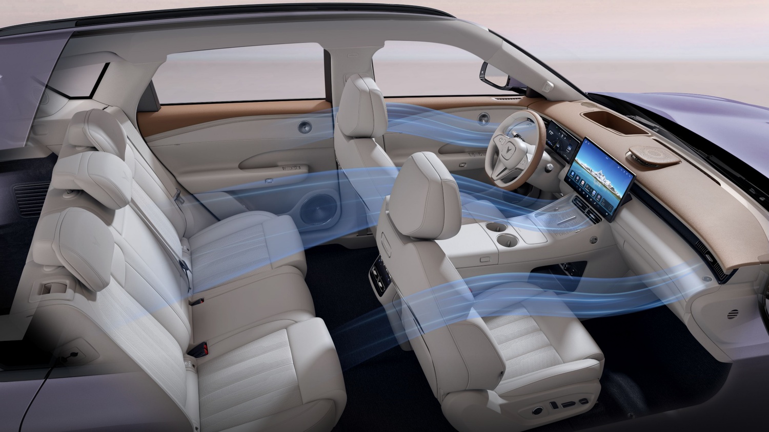 • Pasagerii au acces la o cutie de depozitare de 7 litri cu funcții de încălzire și răcire, scaune frontale multifuncționale cu masaj (al pasagerului cu funcție Zero Gravity) și banchetă posterioară cu unghi de înclinare pe un interval de 27 de grade (până la 129 de grade).