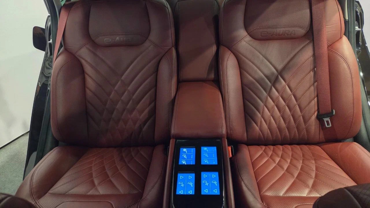 Interiorul lui e-Aura impresionează prin finisaje de calitate, cu tapițerie din piele naturală de proveniență rusească, scaune posterioare individuale cu suport lateral și o consolă centrală largă dotată cu un centru de control tactil pentru diverse funcții.