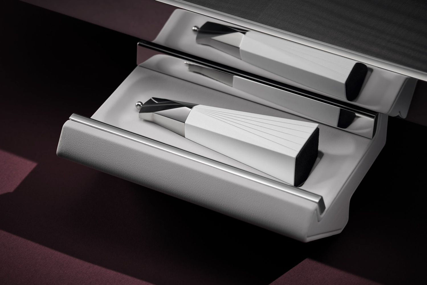 Două sertare discrete, accesibile printr-o atingere ușoară, conțin regine suplimentare pentru promovarea pieselor în timpul jocului. Placa și suportul pieselor sunt încadrate de margini din aluminiu lustruit. Emblema Spirit of Ecstasy, plasată discret pe față și spate, confirmă autenticitatea setului.
