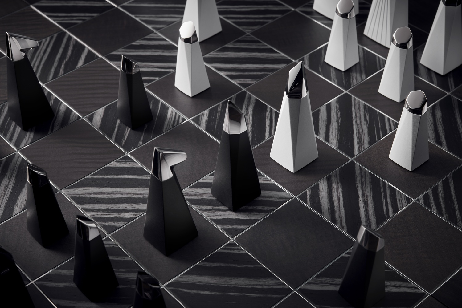 Fiecare piesă de șah este o operă sculpturală, realizată din aluminiu acoperit cu ceramică, cu suprafețe fațetate și baze pătrate. Piesele includ magneți ascunși și sunt încoronate cu capete din oțel inoxidabil lustruit, evocând comenzile metalice din interiorul automobilelor Rolls-Royce.