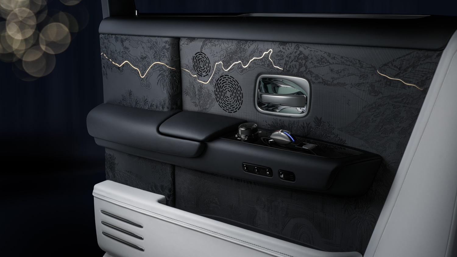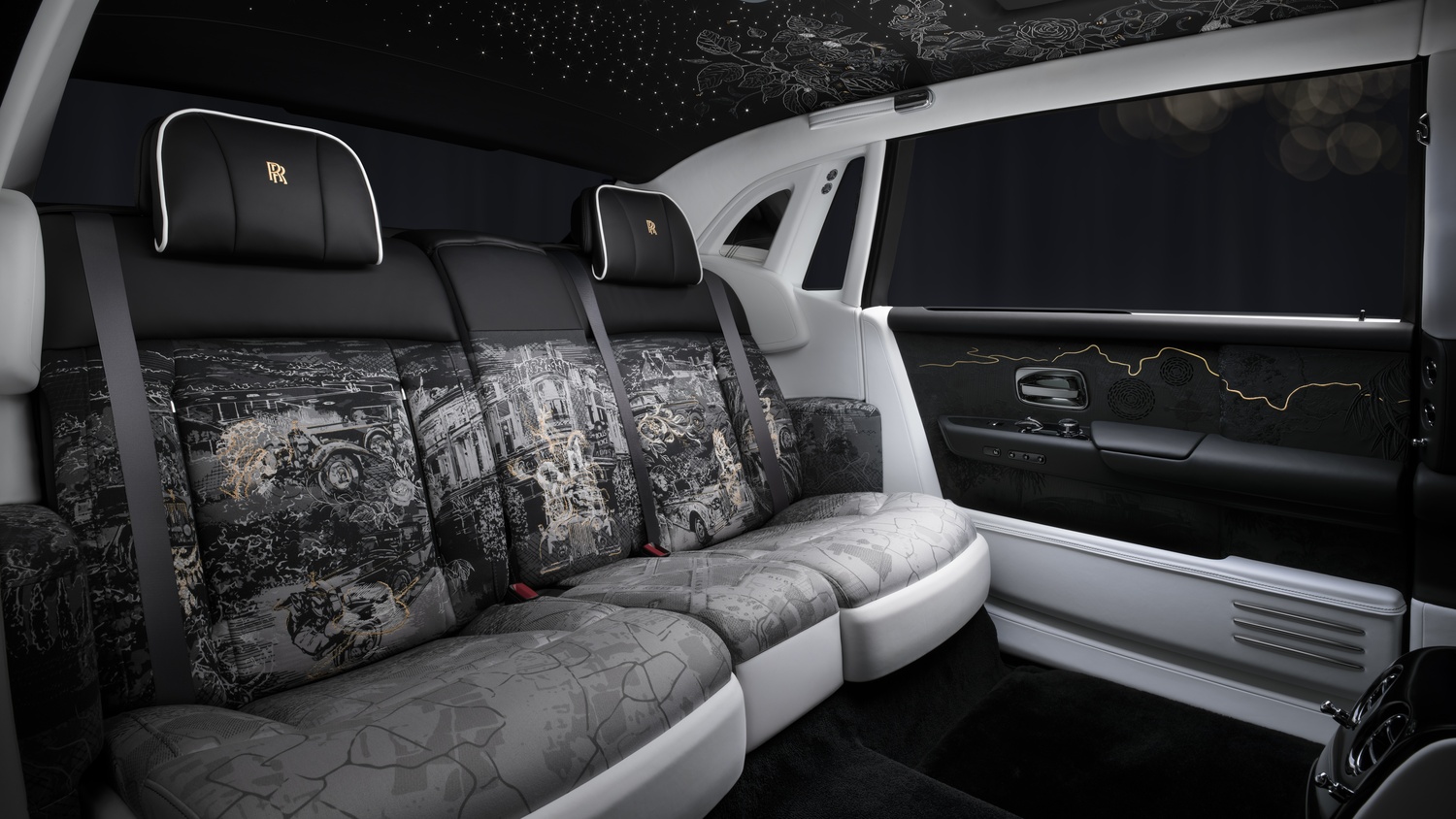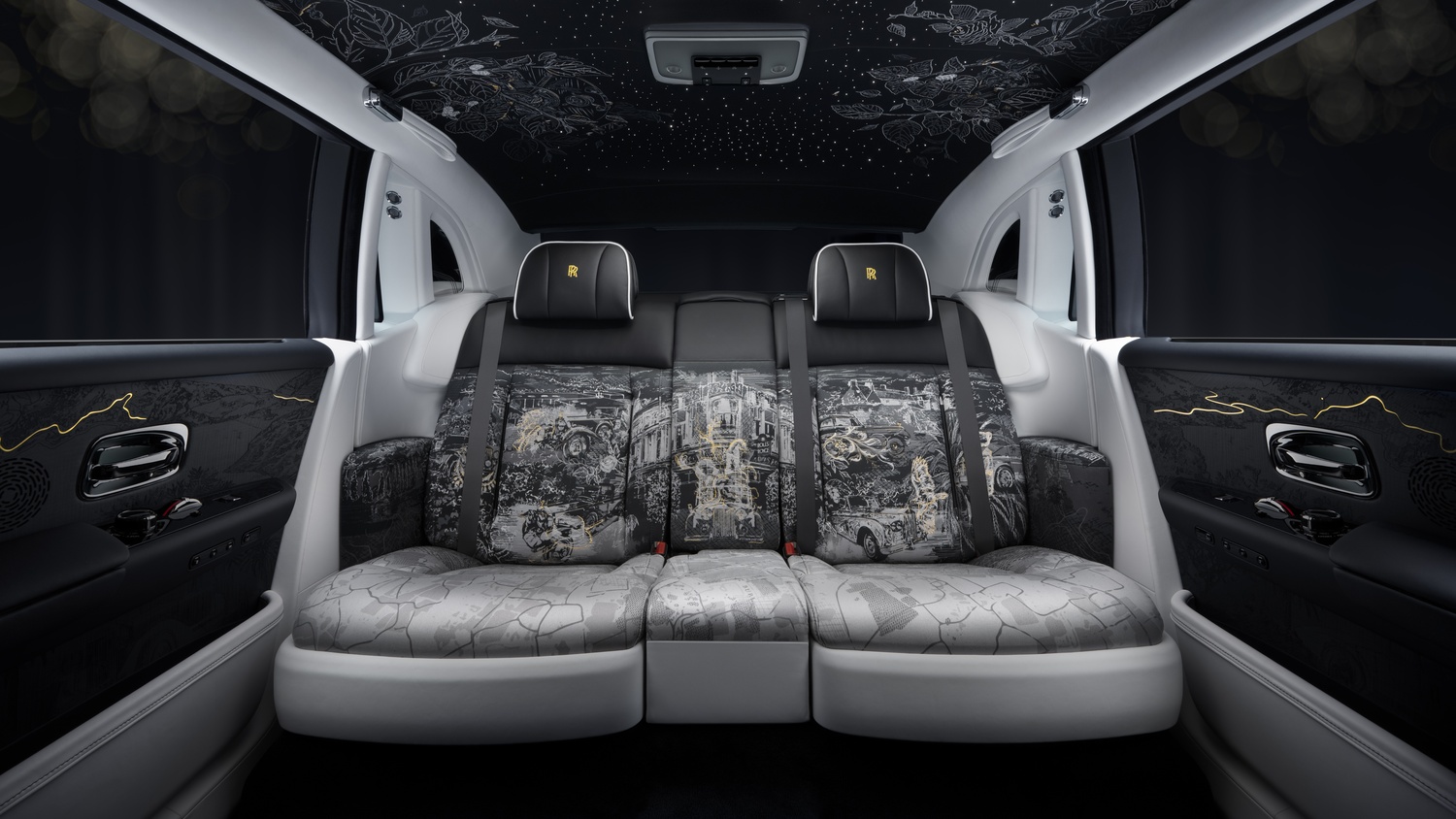 Scaunele din spate sunt un punct culminant, cu o țesătură imprimată de înaltă rezoluție, dezvoltată timp de 12 luni în parteneriat cu un atelier de modă, marcând prima sa comandă din afara lumii haute couture. Țesătura, în trei straturi narative, prezintă locuri și artefacte din istoria Phantom – de la sediul original de pe Conduit Street din Londra la picturile în ulei ale lui Sir Henry Royce din sudul Franței. Al doilea strat ilustrează modele Phantom de la I la VII, iar al treilea include șapte broderii abstracte, reprezentând proprietari renumiți din fiecare generație, realizate cu peste 160.000 de cusături.