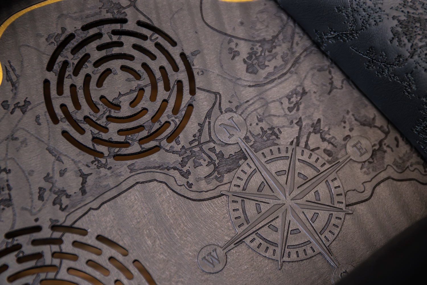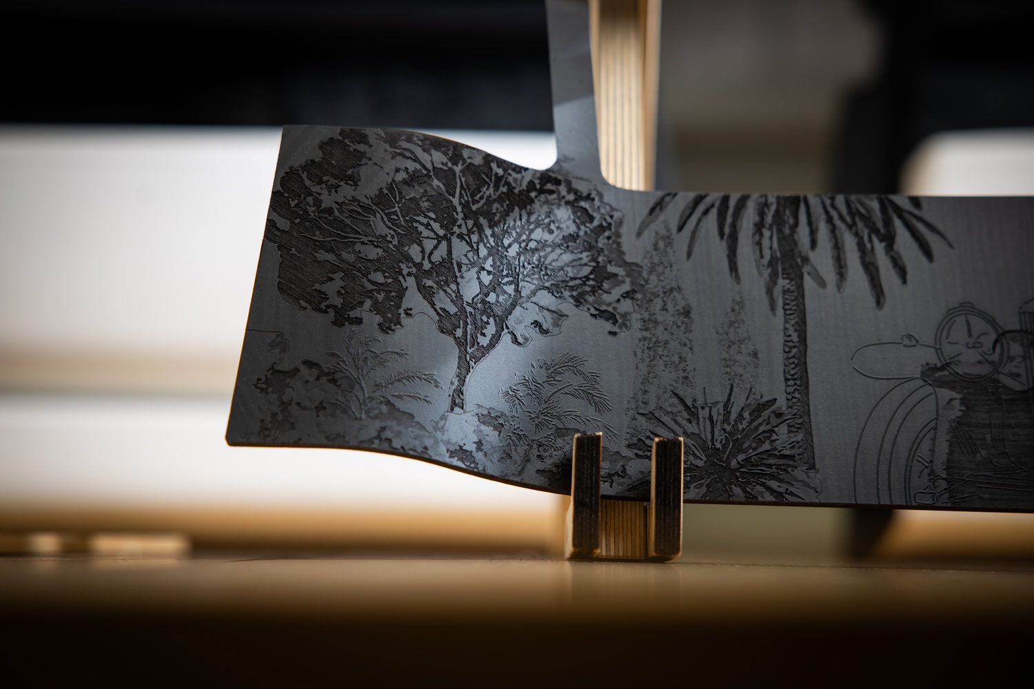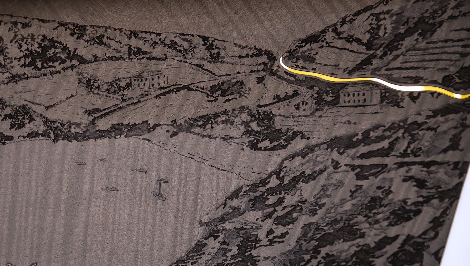 Fiecare panou combină marchetărie 3D, gravură cu laser, stratificare de cerneală 3D și foiță de aur de 24 de carate. Motivele, incluzând hărți, peisaje, flori și mașini experimentale, sunt gravate la trei adâncimi diferite, creând contrast între suprafețele lucioase și cele mai închise. Straturile de cerneală 3D adaugă detalii fine, de 0.13 mm înălțime, precum bărci sau nume de locații, folosind șase straturi de cerneală de 0.02 mm. Drumurile sunt realizate din foiță de aur de 0.1 micrometri, tăiate cu precizie între 0.38 și 2.5 mm lățime, aplicate manual și sigilate.