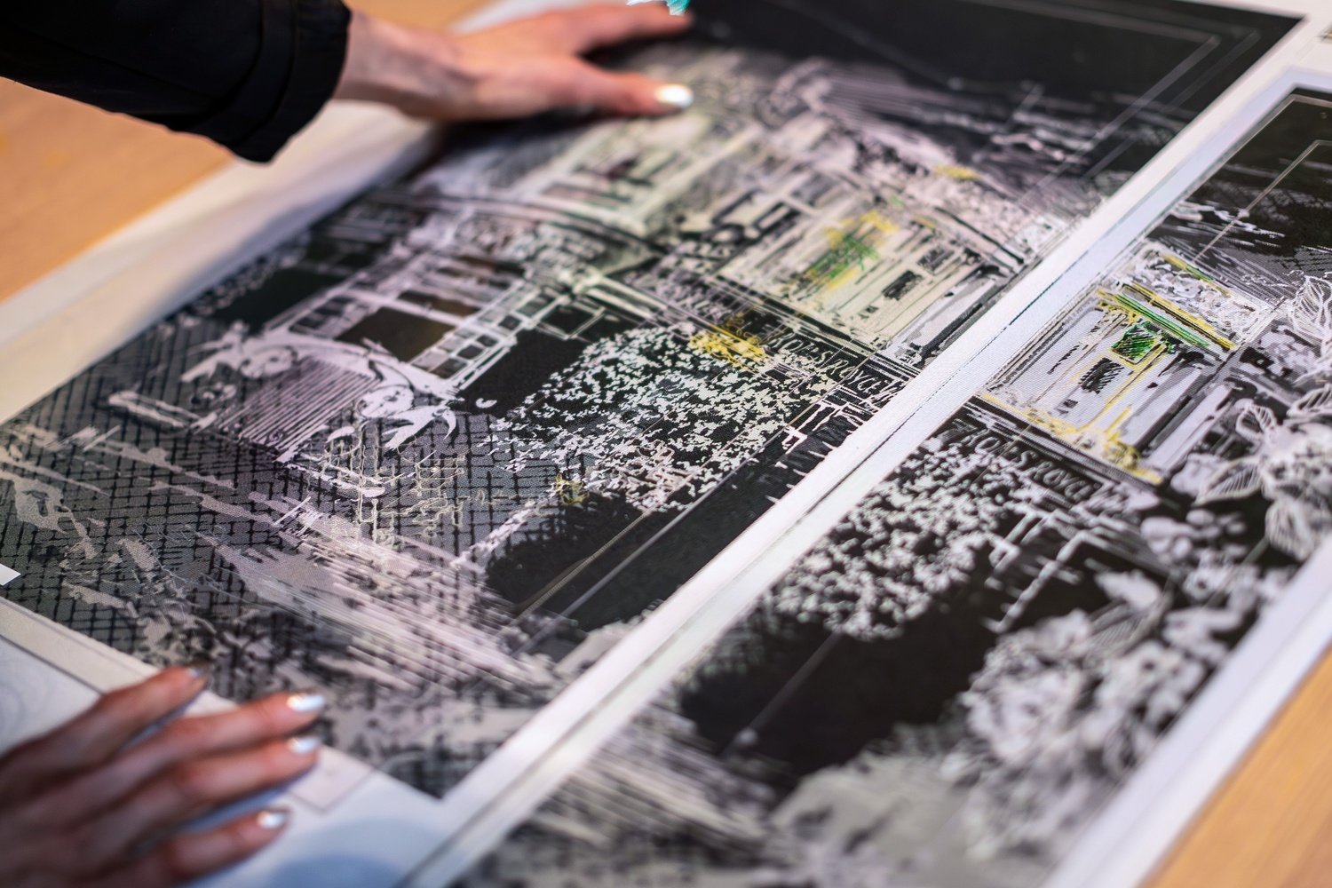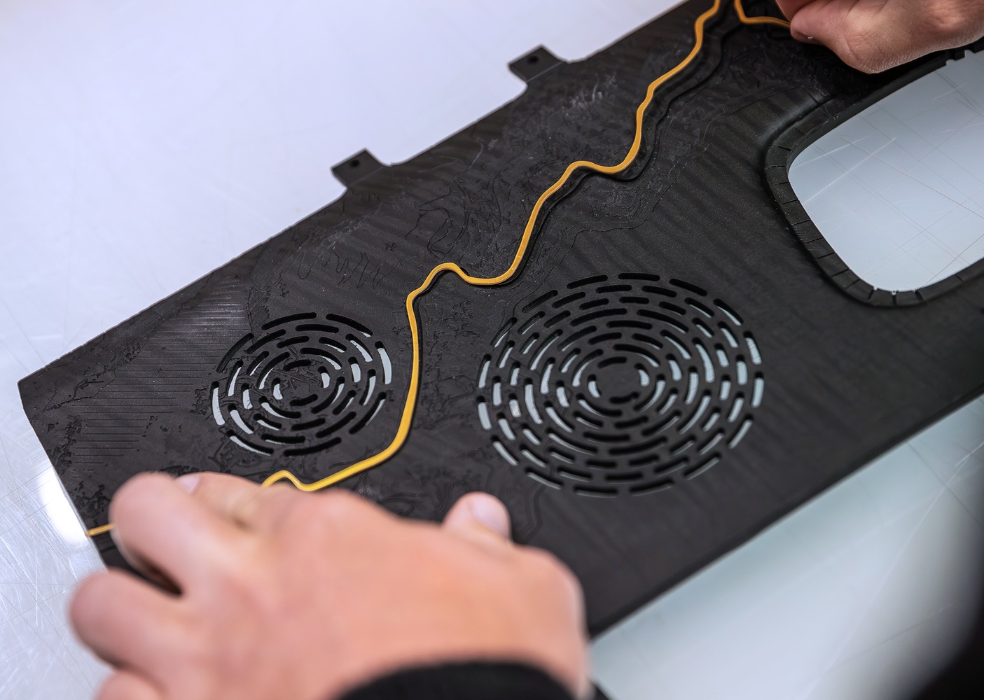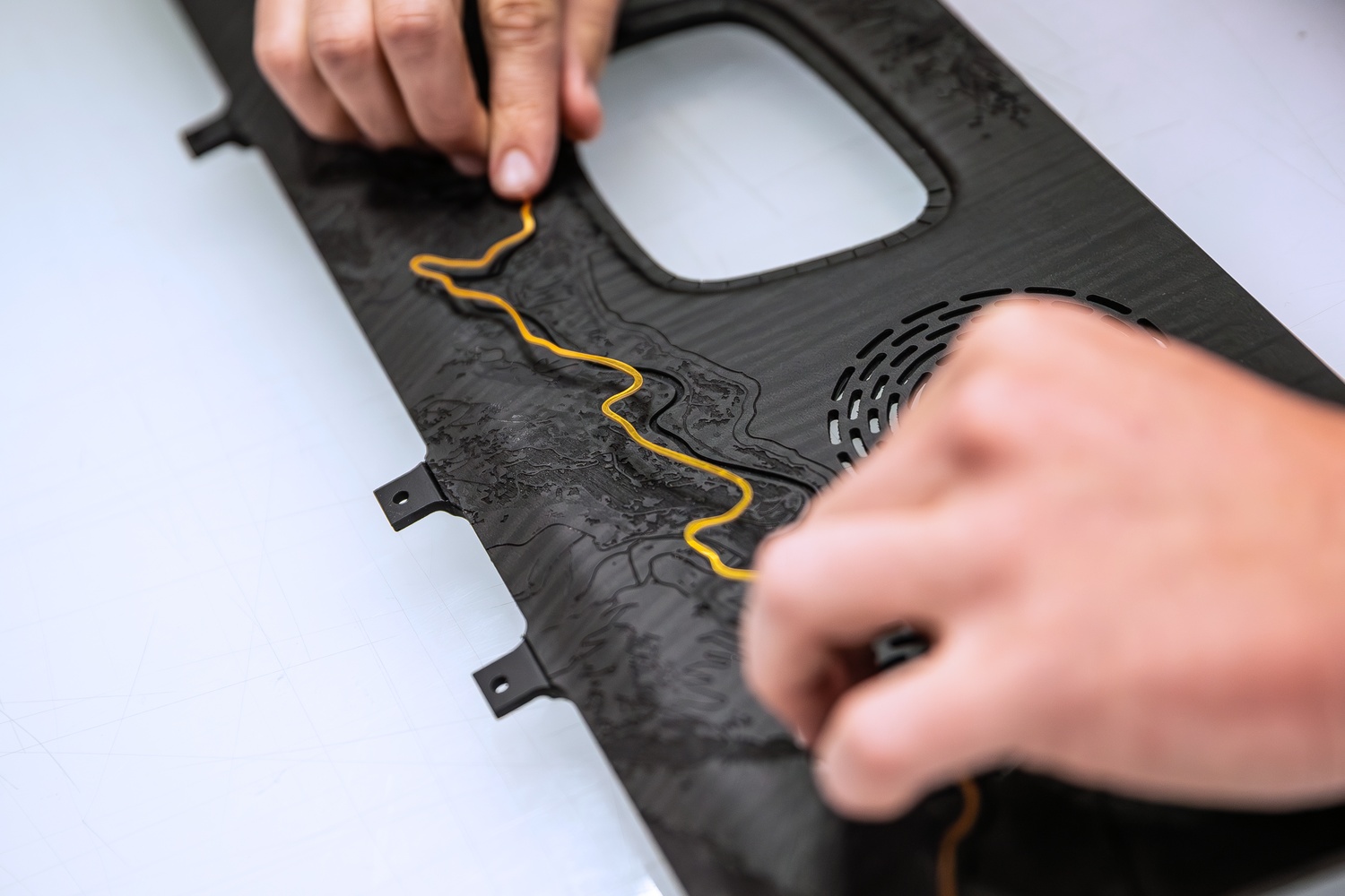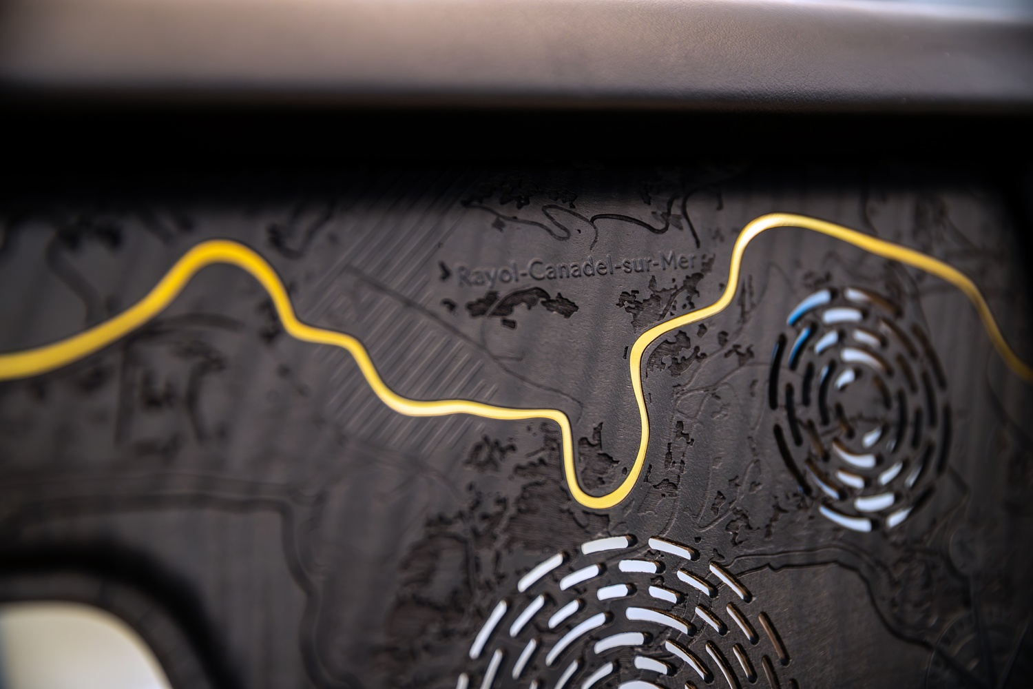 Fiecare panou combină marchetărie 3D, gravură cu laser, stratificare de cerneală 3D și foiță de aur de 24 de carate. Motivele, incluzând hărți, peisaje, flori și mașini experimentale, sunt gravate la trei adâncimi diferite, creând contrast între suprafețele lucioase și cele mai închise. Straturile de cerneală 3D adaugă detalii fine, de 0.13 mm înălțime, precum bărci sau nume de locații, folosind șase straturi de cerneală de 0.02 mm. Drumurile sunt realizate din foiță de aur de 0.1 micrometri, tăiate cu precizie între 0.38 și 2.5 mm lățime, aplicate manual și sigilate.