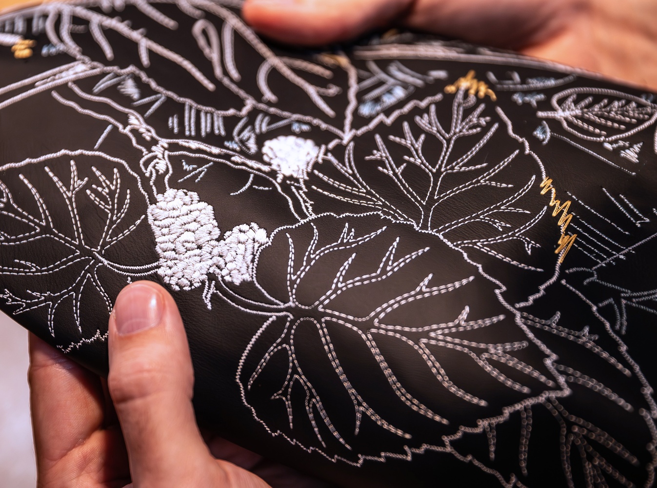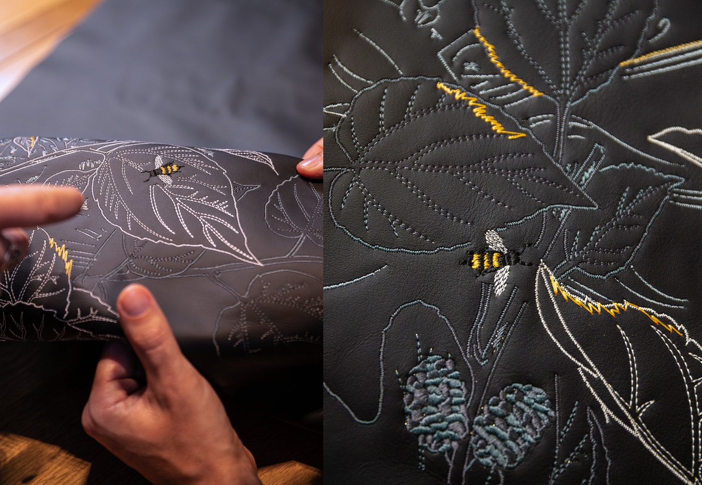 Broderiile, descrise ca „schițe cu ață”, folosesc fir Golden Sands pentru contururi neregulate, creând iluzia de linii plutitoare, dar și fir Seashell pentru textură densă. Fiecare imprimeu, precum cel al unui cal, a fost perfecționat cu tehnici variate de cusătură pentru a reda detalii precum textura părului sau musculatura, unele necesitând 24 de iterații. Cele 45 de panouri de țesătură sunt aliniate cu precizie pe curbura scaunelor, inspirându-se din tehnicile de croitorie Savile Row.
