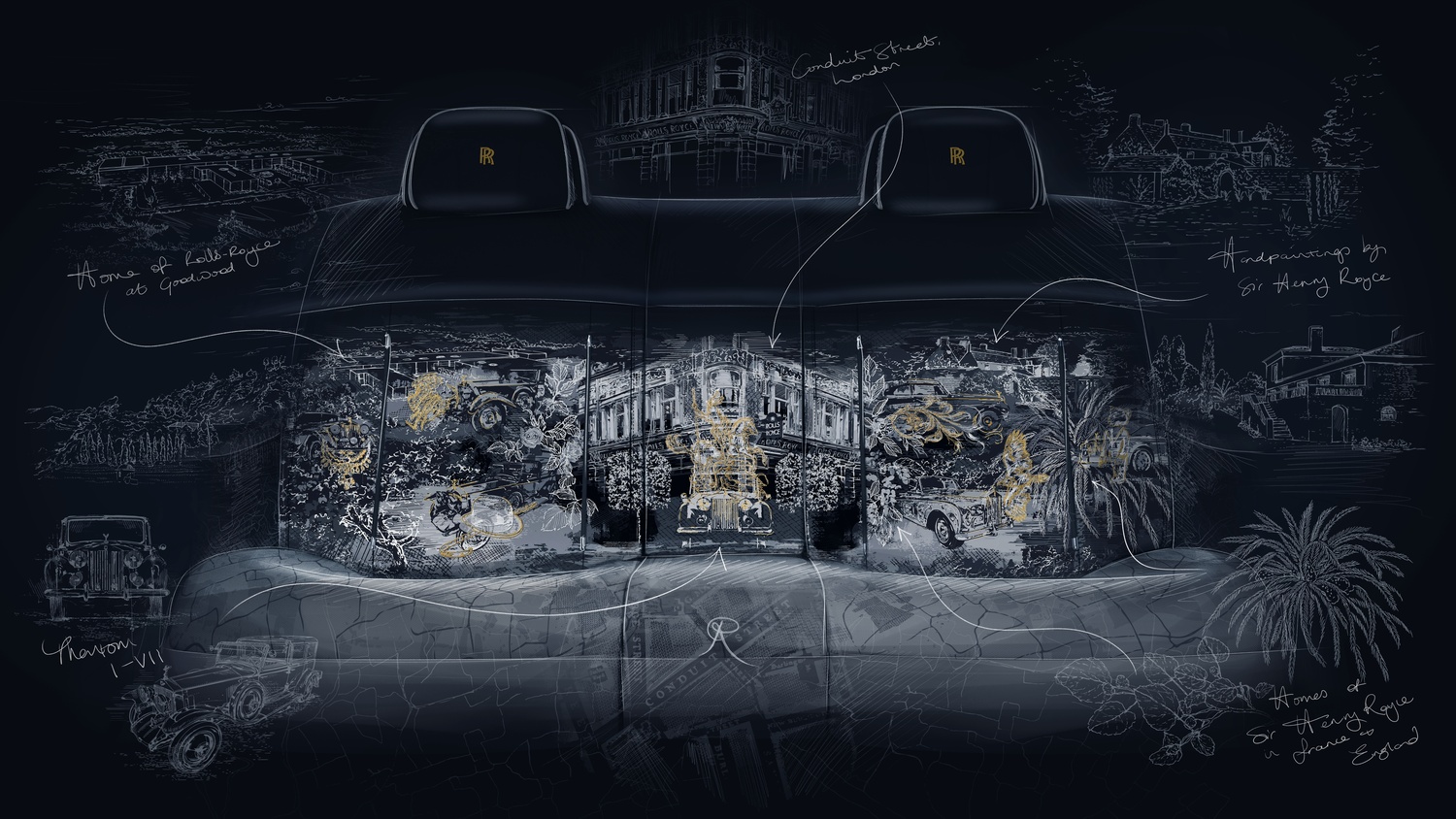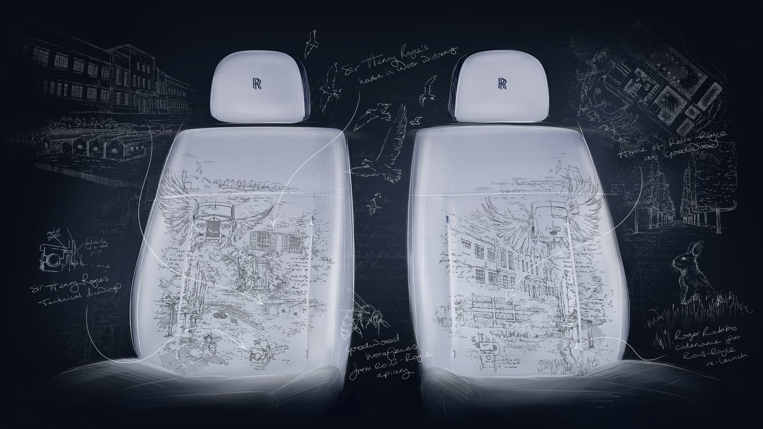 Scaunele frontale, tapițate în piele albă, prezintă opere de artă gravate cu laser, o premieră pentru Rolls-Royce. Inspirate de schițele unui designer Bespoke, aceste motive evocă meșteșugul desenatorului, incluzând detalii simbolice precum iepurele „Roger Rabbit” – numele de cod al relansării Rolls-Royce din 2003 – și „Seagull”, numele de cod al prototipului Phantom I din 1923. Alte desene includ fabrica din Derby, casa Elmstead a lui Sir Henry Royce din West Wittering și o schiță abstractă a unei valve de motor, omagiind ingineria Phantom.