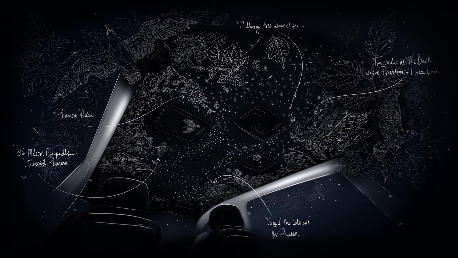 Plafonul capturează momente din istoria Phantom cu 440.000 de cusături, incluzând referințe la dudul sub care Sir Henry Royce discuta cu colaboratorii săi, Charles L. Jenner și Ernest Hives, în grădina sa din West Wittering. Designul include 100 de frunze de dud, arbori cu coroane pătrate din curtea sediului Goodwood și albine, evocând cele 250.000 din stupii Rolls-Royce.