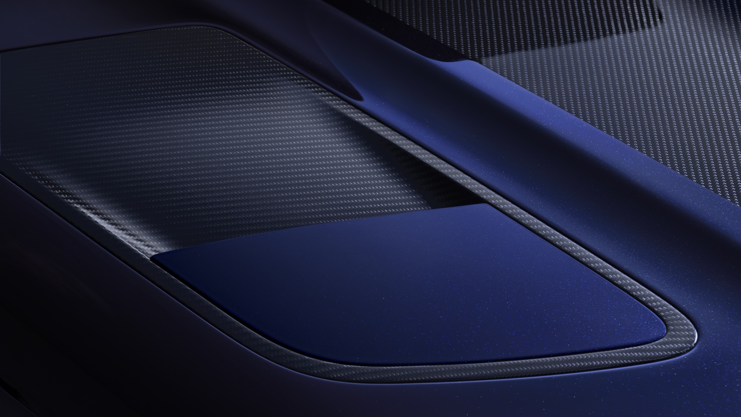 Capota din fibră de carbon expusă, pachetul exterior din fibră de carbon twill satinată și emblemele Black Chrome Metal cu inserții Indigo Gloss adaugă un caracter de performanță. Jantele Thunderball de 23 de inchi în Champagne Gold Satin, cu etriere de frână în nuanța Black Carbon, completează exteriorul, în timp ce interiorul prezintă un split colorway cu detalii exclusive.