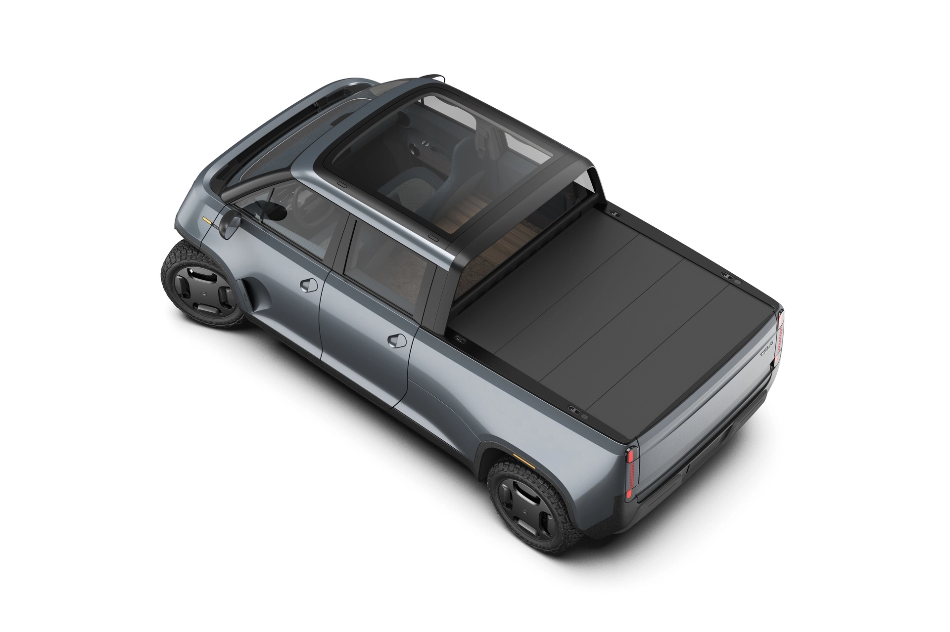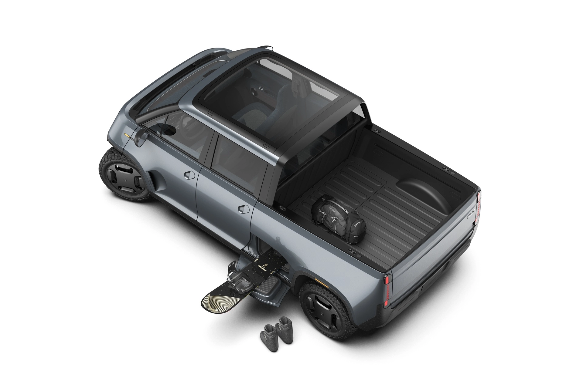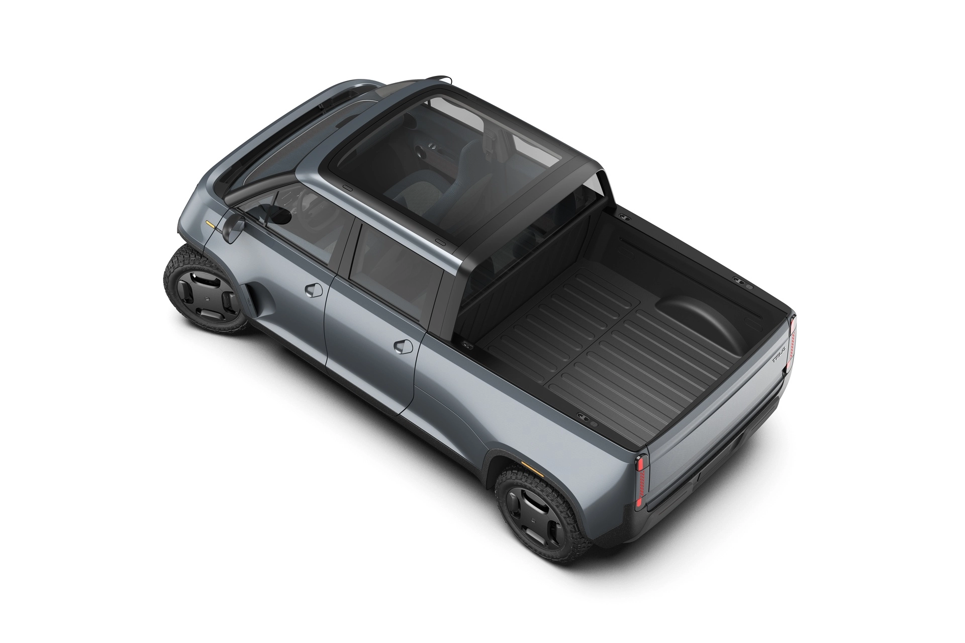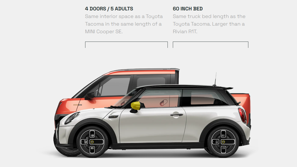 - Amprentă compactă: TELO MT1 are lungimea unui MINI Cooper SE, dar oferă spațiul interior al unui Toyota Tacoma, fiind cel mai mic pickup din piața americană.