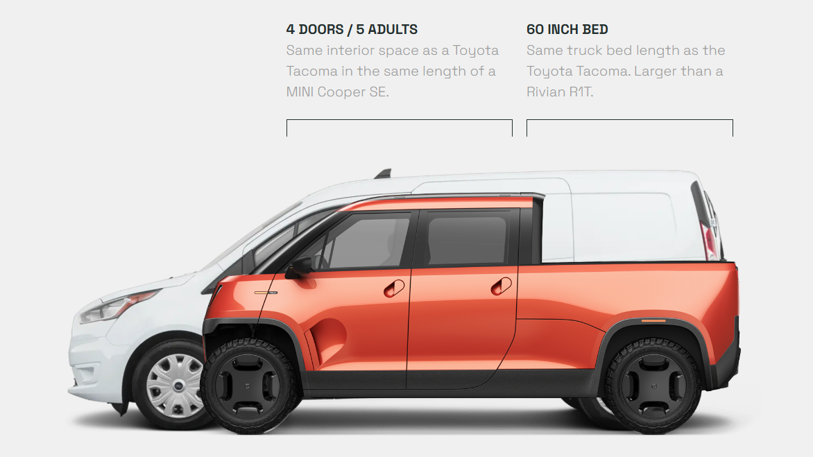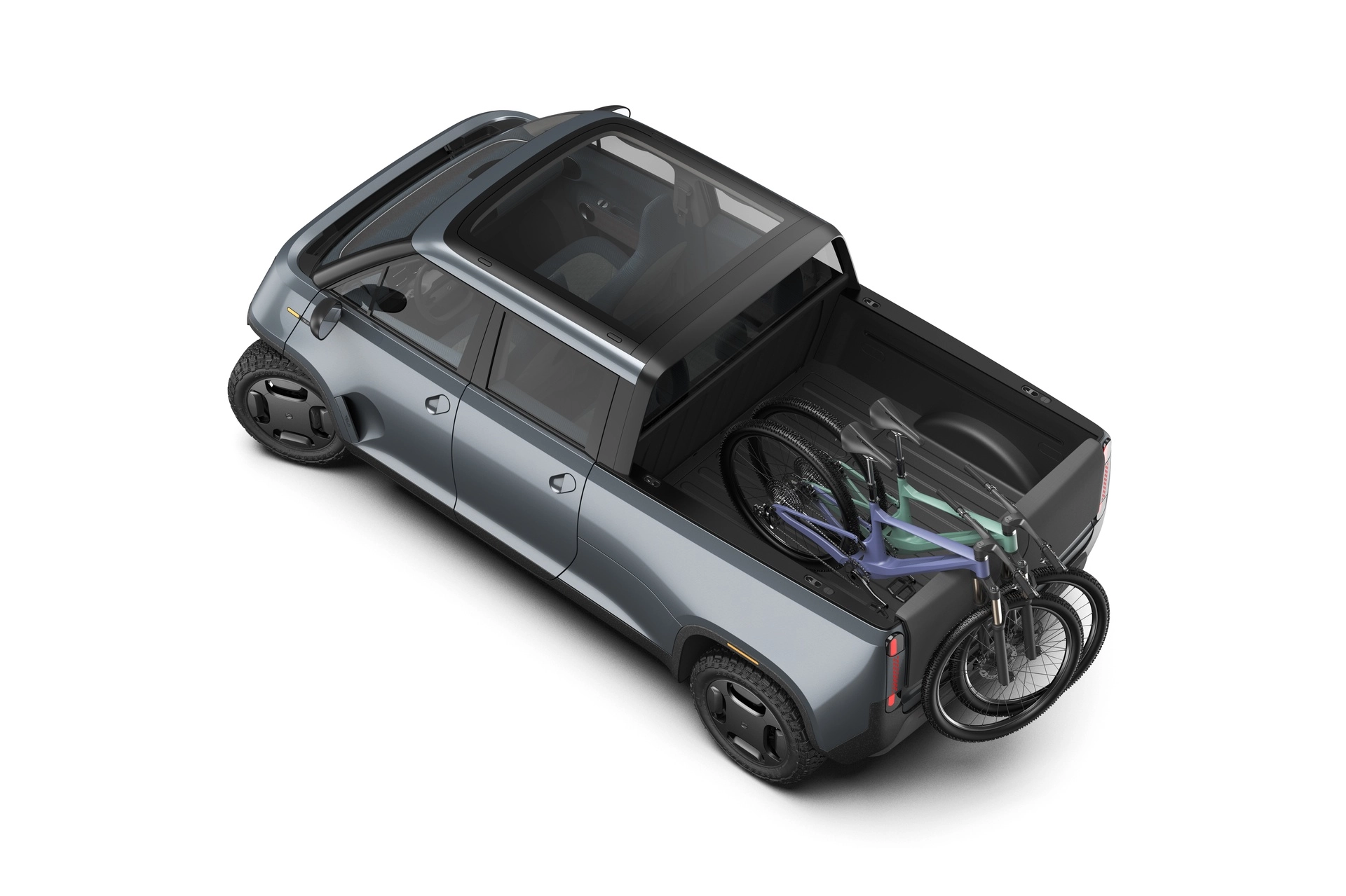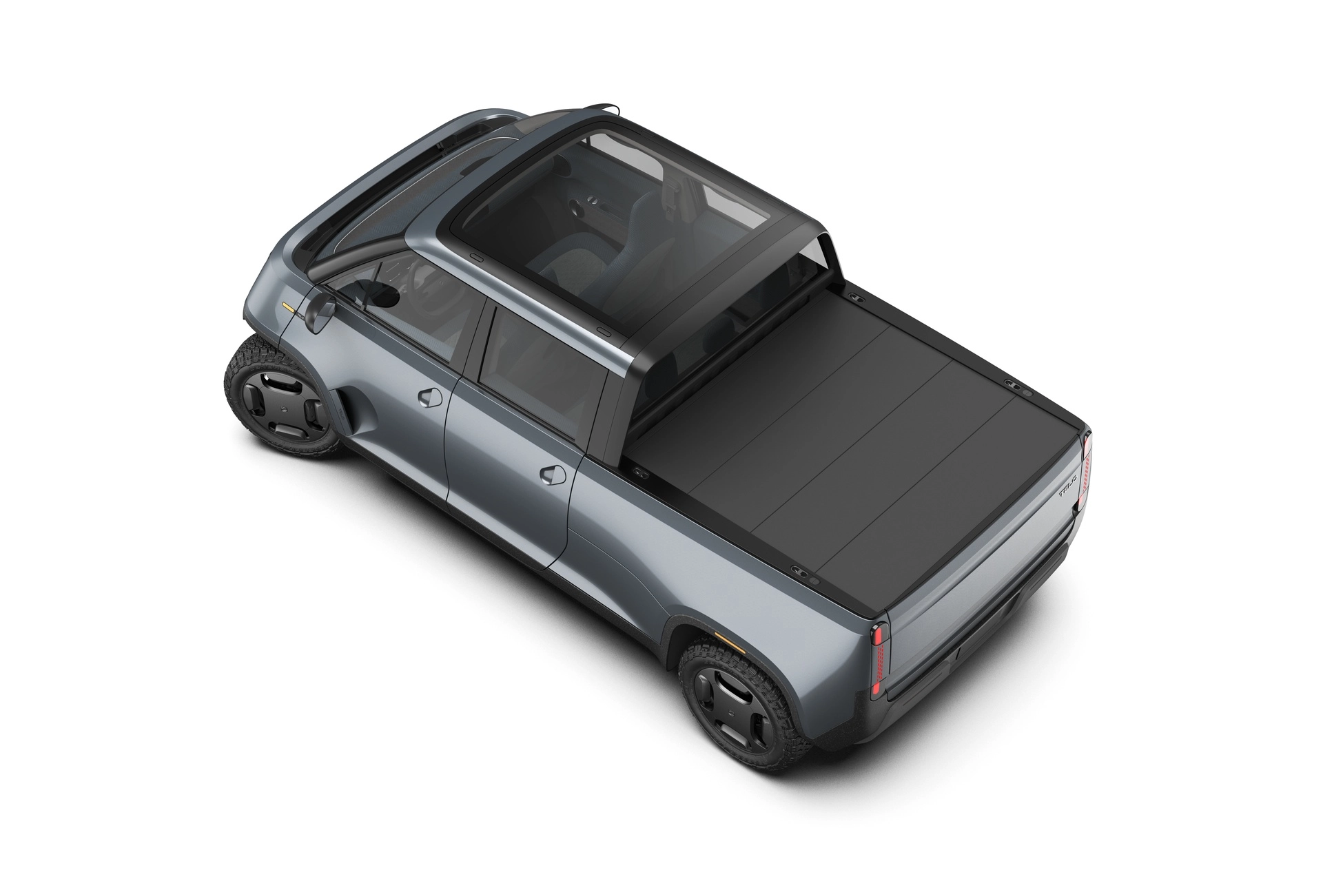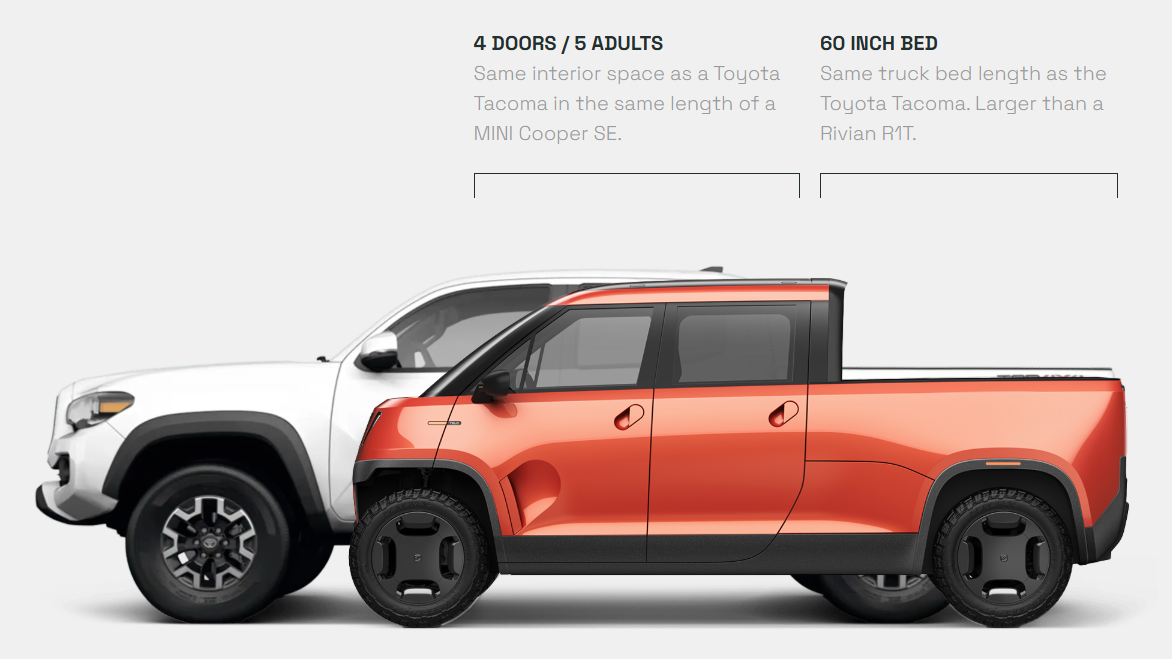 - Amprentă compactă: TELO MT1 are lungimea unui MINI Cooper SE, dar oferă spațiul interior al unui Toyota Tacoma, fiind cel mai mic pickup din piața americană.