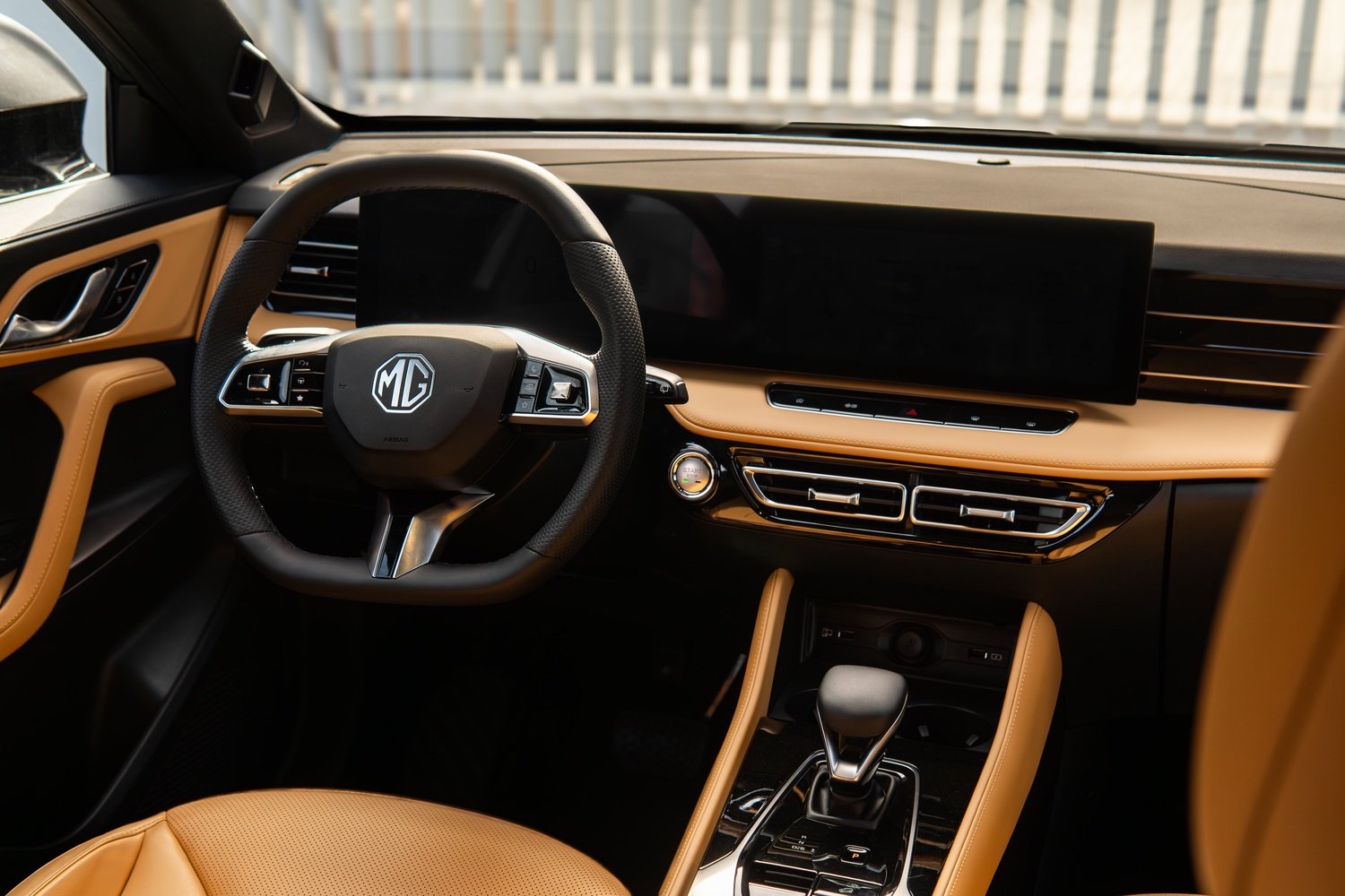 Interiorul lui MG HS a fost complet modernizat. Planșa de bord este dominată de două ecrane de 12.,3 inchi, unul pentru instrumentarul de bord și unul pentru sistemul multimedia. Grafica este clară, iar meniurile sunt ușor de navigat. Sistemul multimedia suportă Apple CarPlay și Android Auto, însă conectivitatea se face prin cablu, nu wireless. Încă un avantaj: mașina dispune de slot pentru SIM și este posibil de instalat o cartelă cu un plan de date mobile, care permite funcționarea serviciilor de urgență (un buton SOS este montat în plafon) și, probabil, actualizări over-the-air.