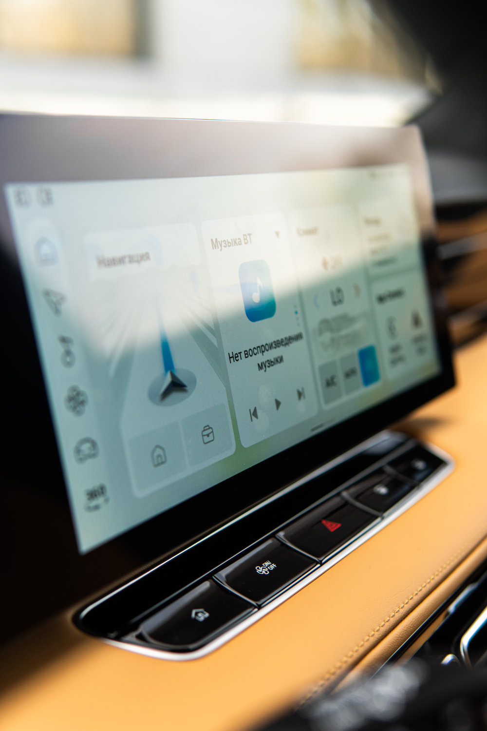 Limba din meniuri, inclusiv pentru panoul de instrumente, poate fi setată în română, engleză sau rusă, ceea ce reprezintă un avantaj pentru piața locală. Climatizarea este automată, pe două zone separate, iar comenzile tactile sunt completate de câteva butoane fizice pentru funcțiile esențiale, precum dezaburirea parbrizului sau întoarcerea la meniul principal.